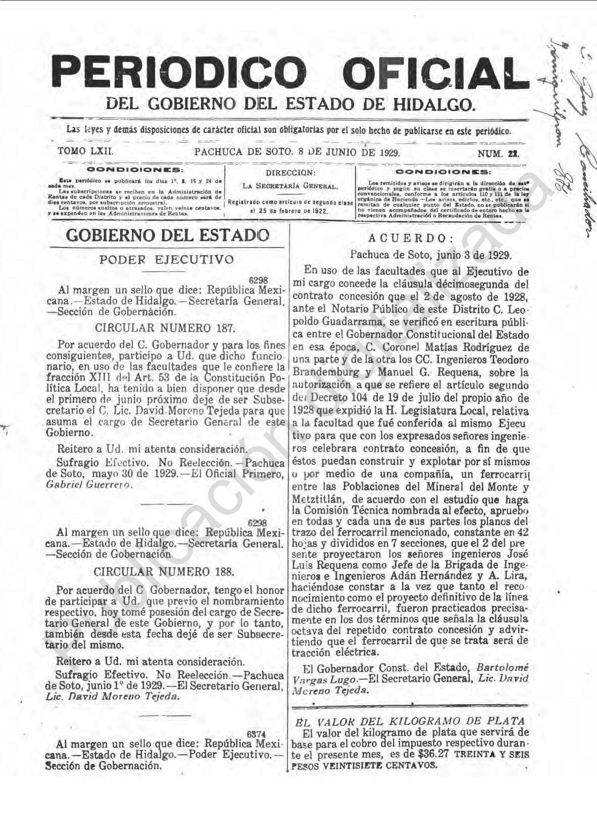 - 6298.-CIRCULAR NUMERO 187.-Por acuerdo del C. Gobernador y para los fines consiguientes, participo a Ud. Que dicho funcionario, en uso de las facultades que le confiere la fracción XIII del Art. 53 de la Constitución Politica Local, ha tenido a bien disponer que desde el primero de junio próximo deje de ser Subsecretario el C. David Moreno Tejeda para que asuma el cargo de Secretario General de este Gobierno.