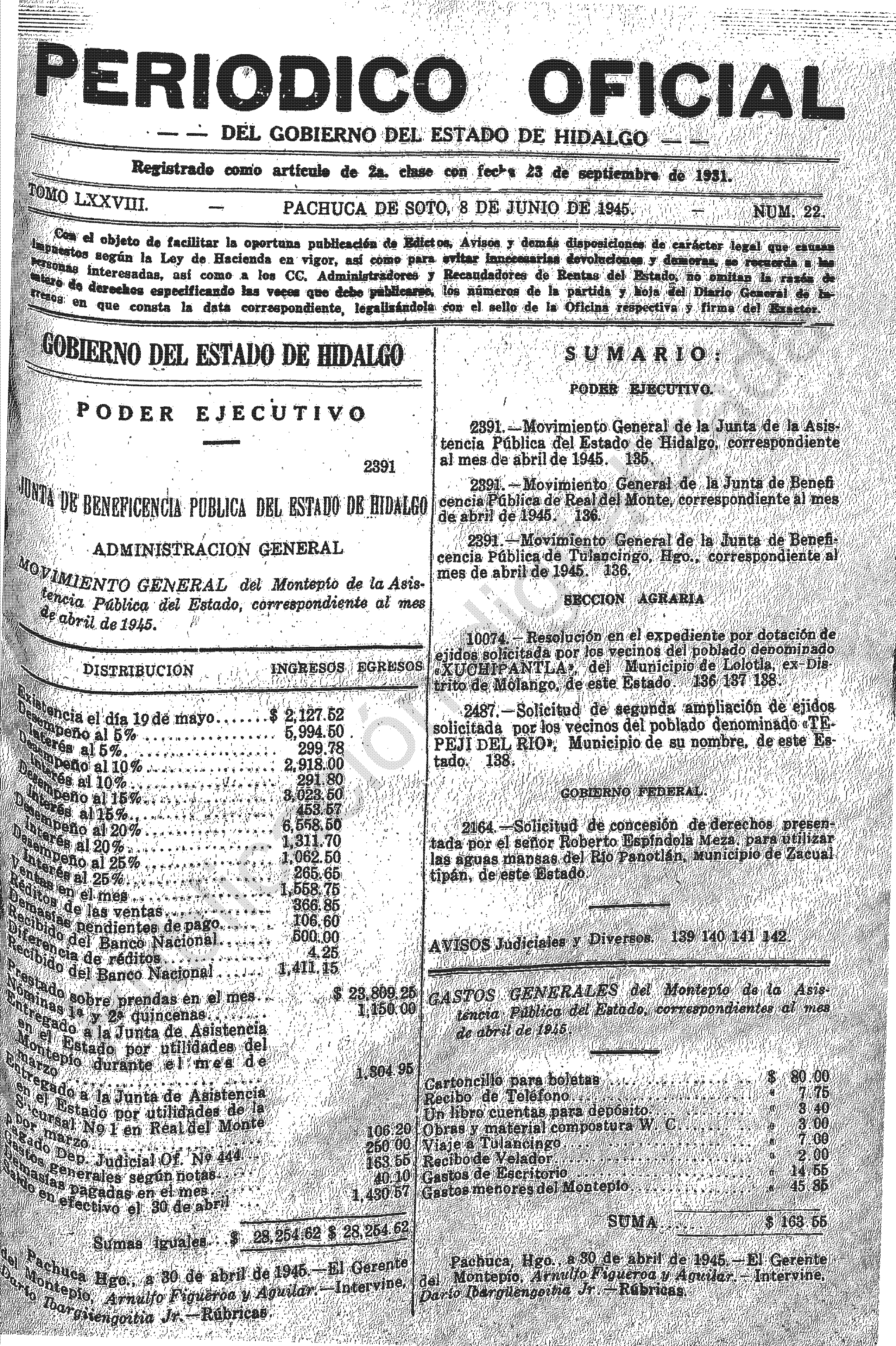 - • 2391.- Movimiento General de la Junta de la Asistencia Pública del Estado de Hidalgo, correspondiente al mes de abril de 1945.