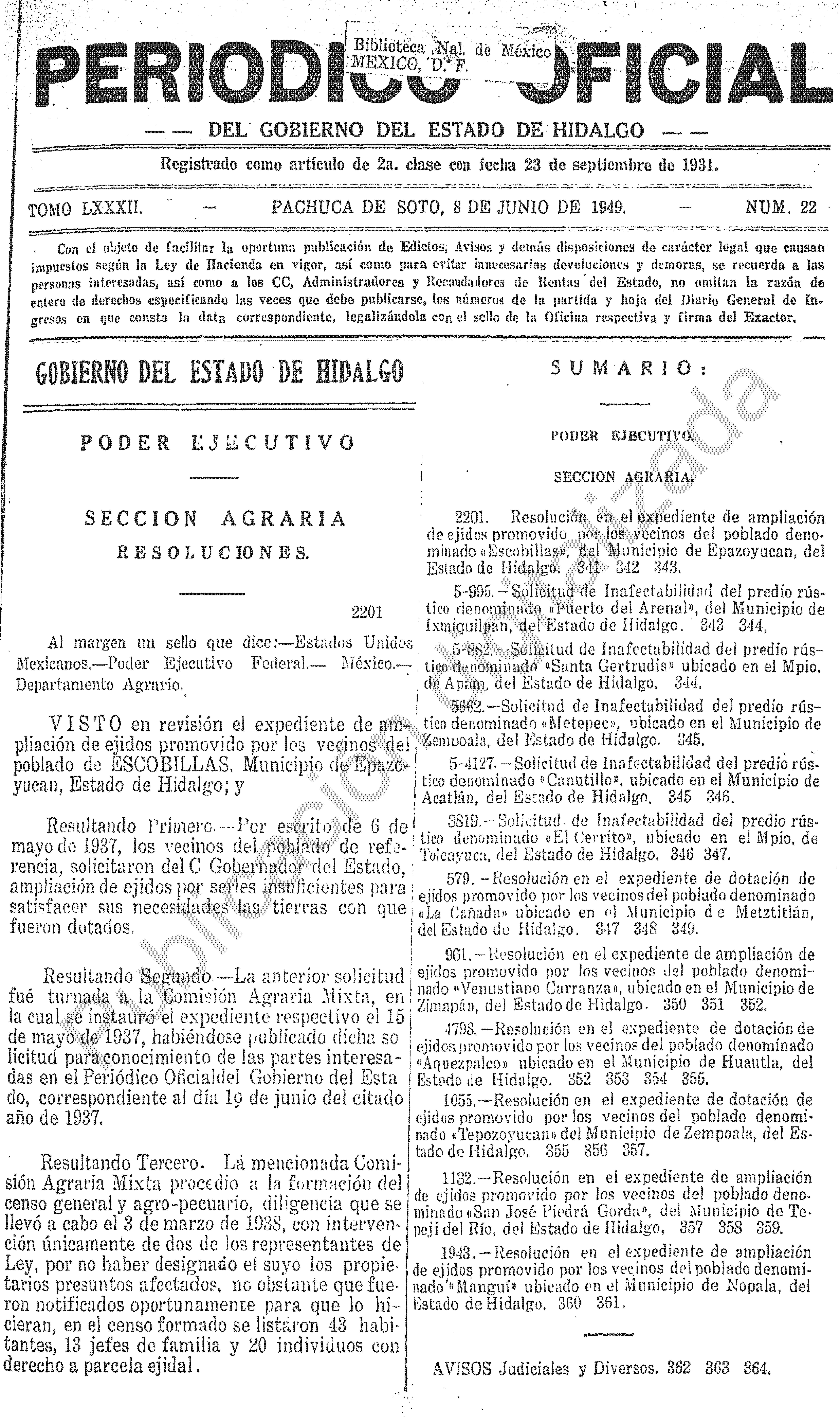 - 2201.- Resolución en el expediente de ampliación de ejidos promovido por los vecinos del poblado denominado “Escobillas”, del Municipio de Epazoyucan, del Estado de Hidalgo.