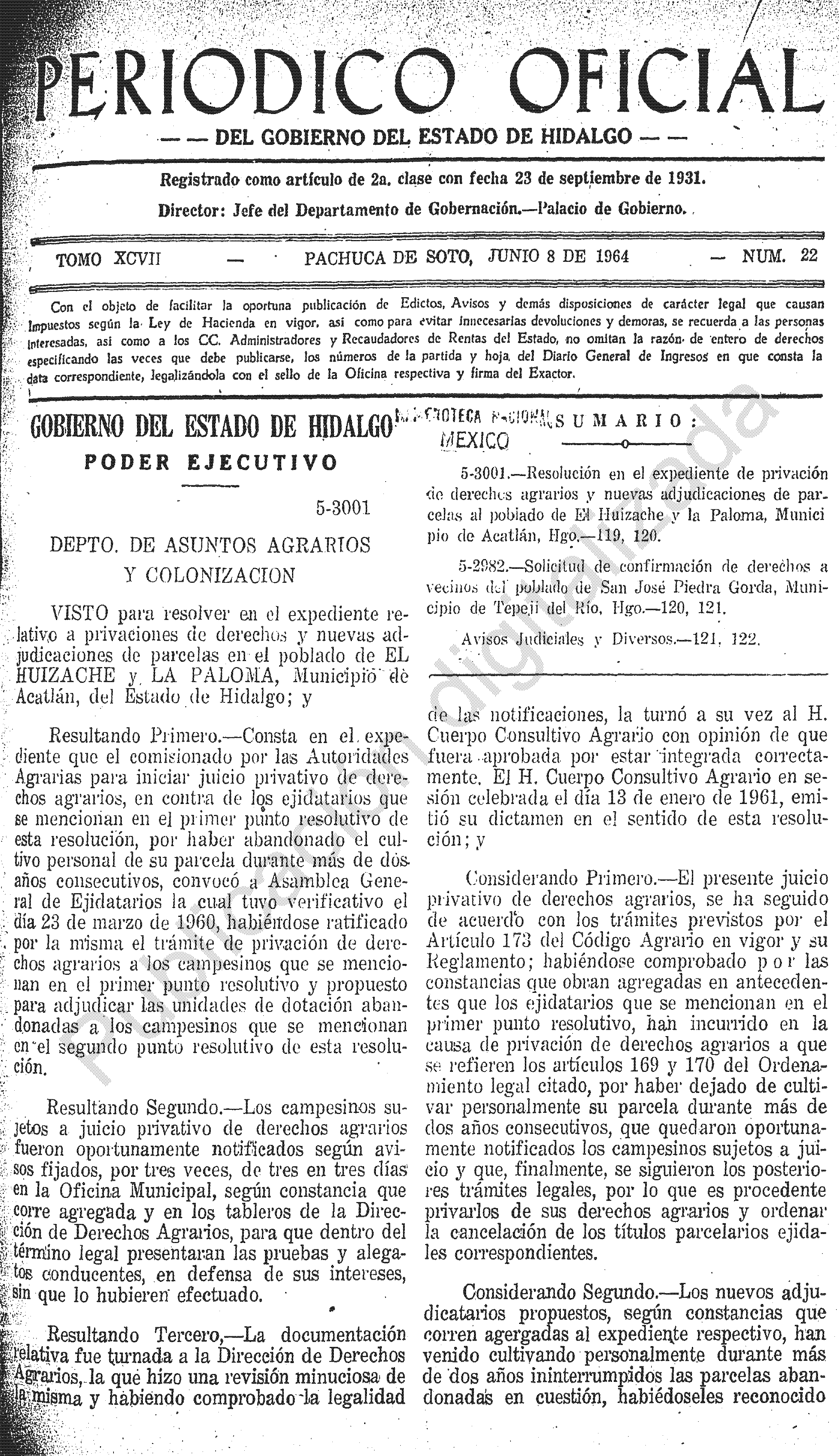 • 5-3001.- Resolución en el expediente de privación de derechos agrarios y nuevas adjudicaciones de parcelas al poblado de El Huizahce y la Paloma, Municipio de Acatlán, Hgo.