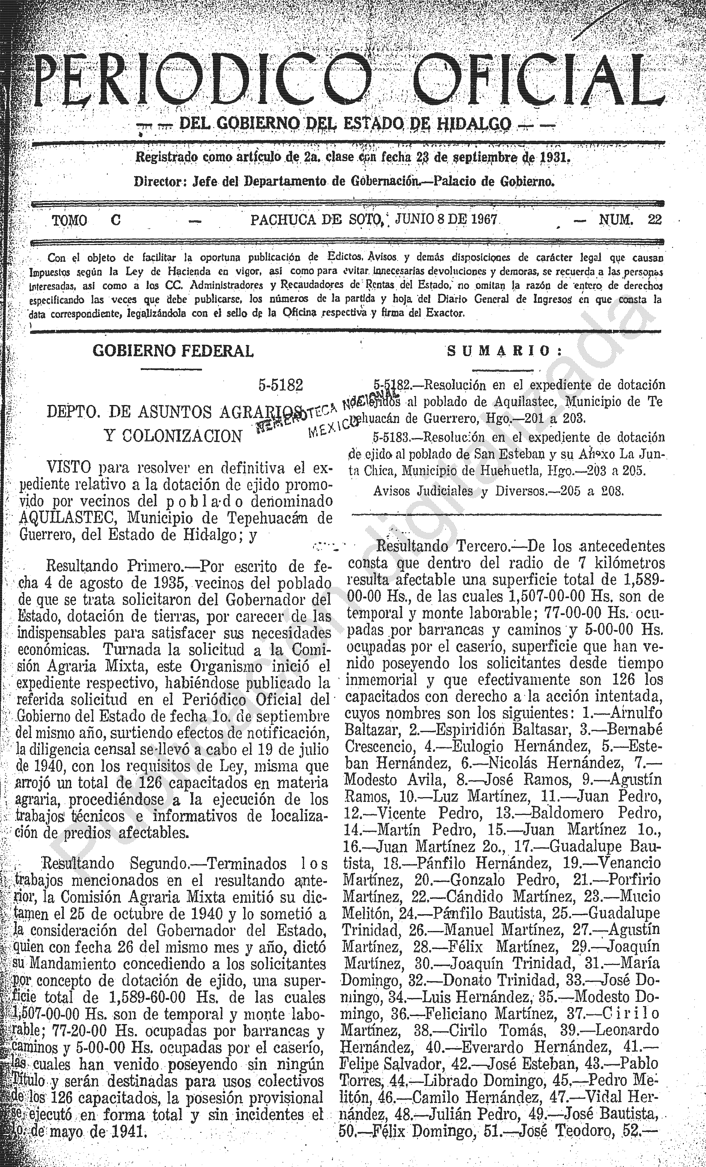- 5-5182.- Resolución en el expediente de dotación de ejidos al poblado de Aquilastec, Municipio de Tepehuacán de Guerrero, Hgo.