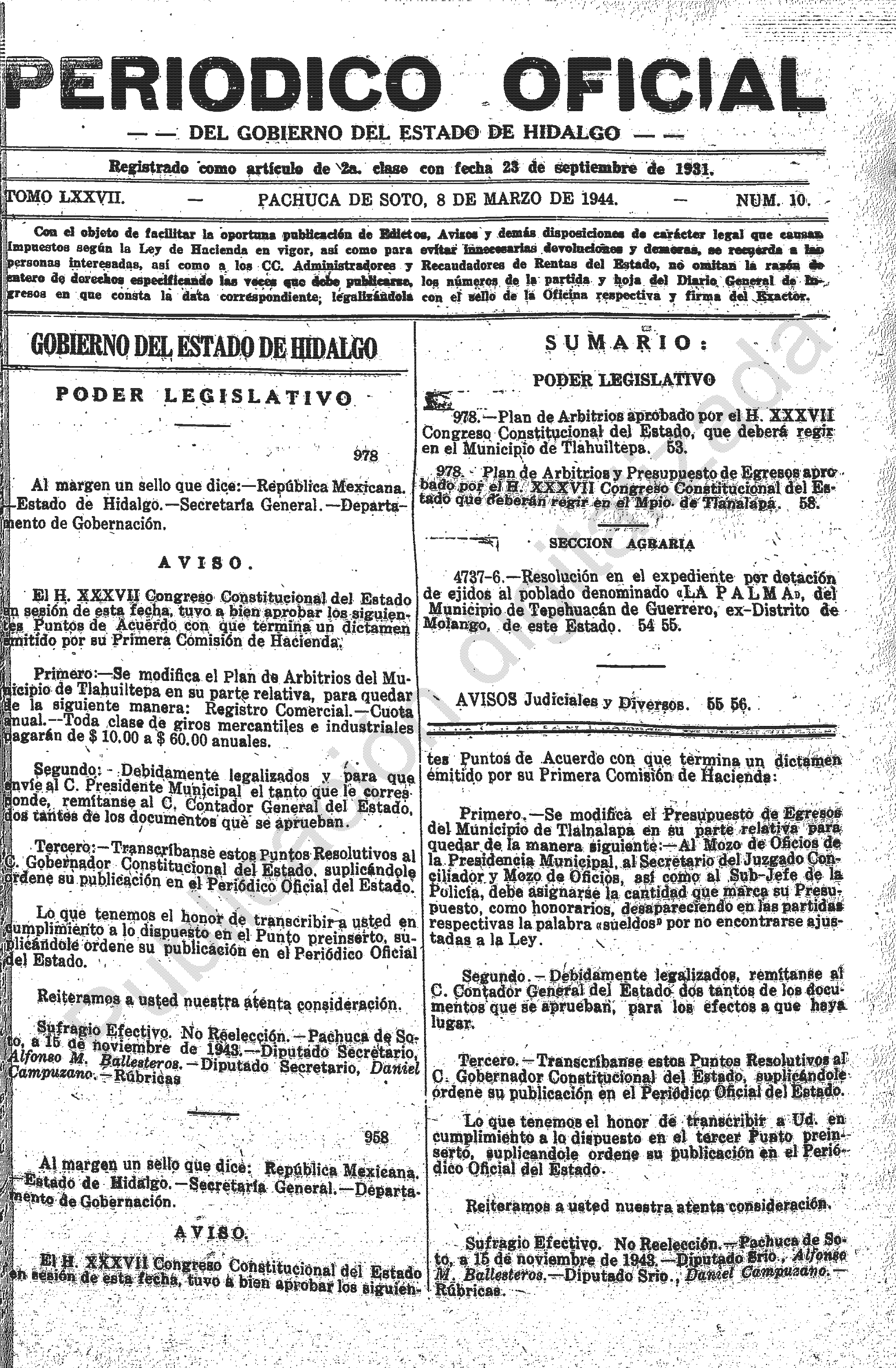 Descargar Periódico Oficial Ordinario 0 del 08 de marzo de 1944