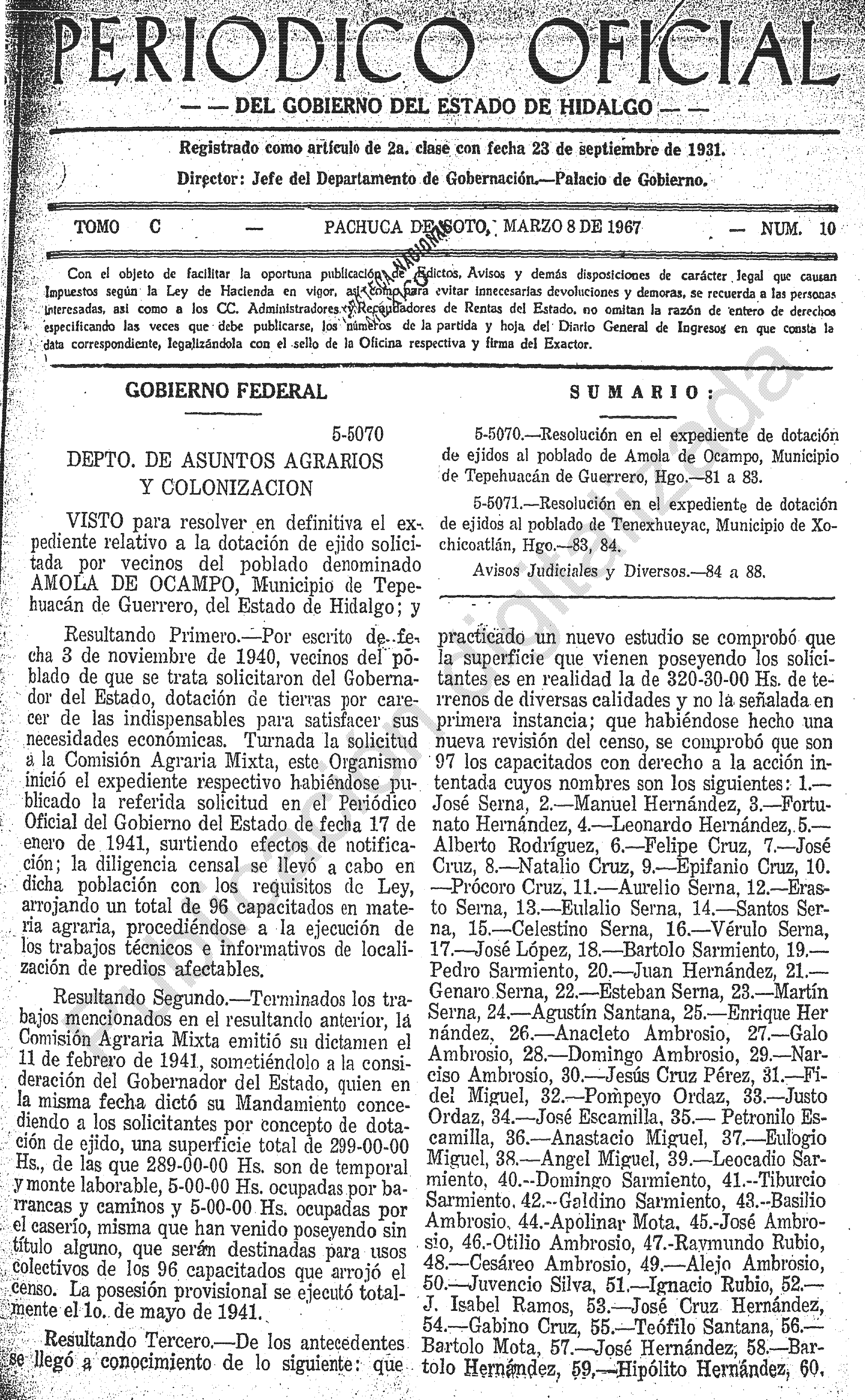 - 5-5070.- Resolución en el expediente de dotación de ejidos al poblado de Amola de Ocampo, Municipio de Tepehuacán de Guerrero, Hgo.