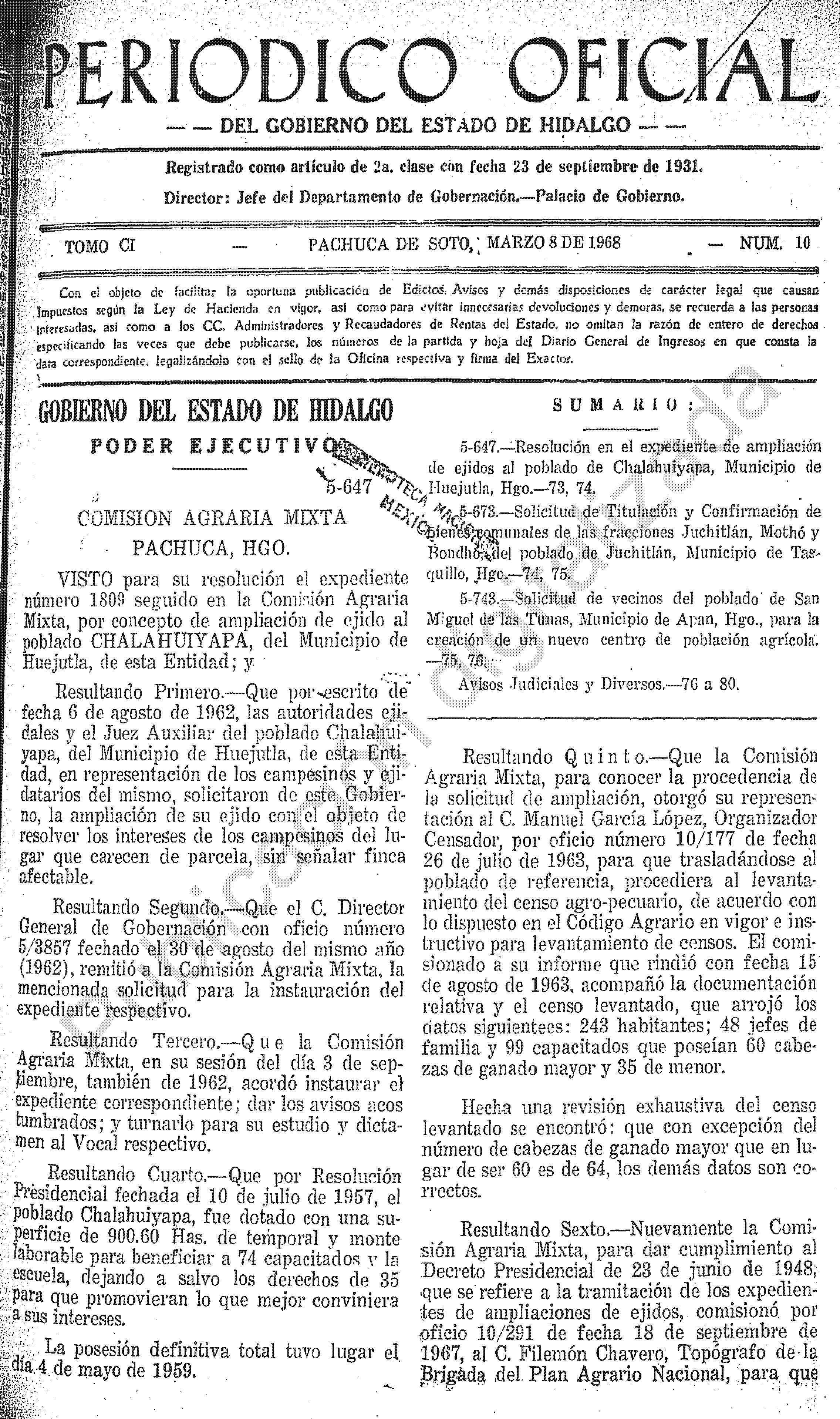 • 5-647.- Resolución en el expediente de ampliación de ejidos al poblado de Chalahuiyapa, Municipio de Huejutla, Hgo.