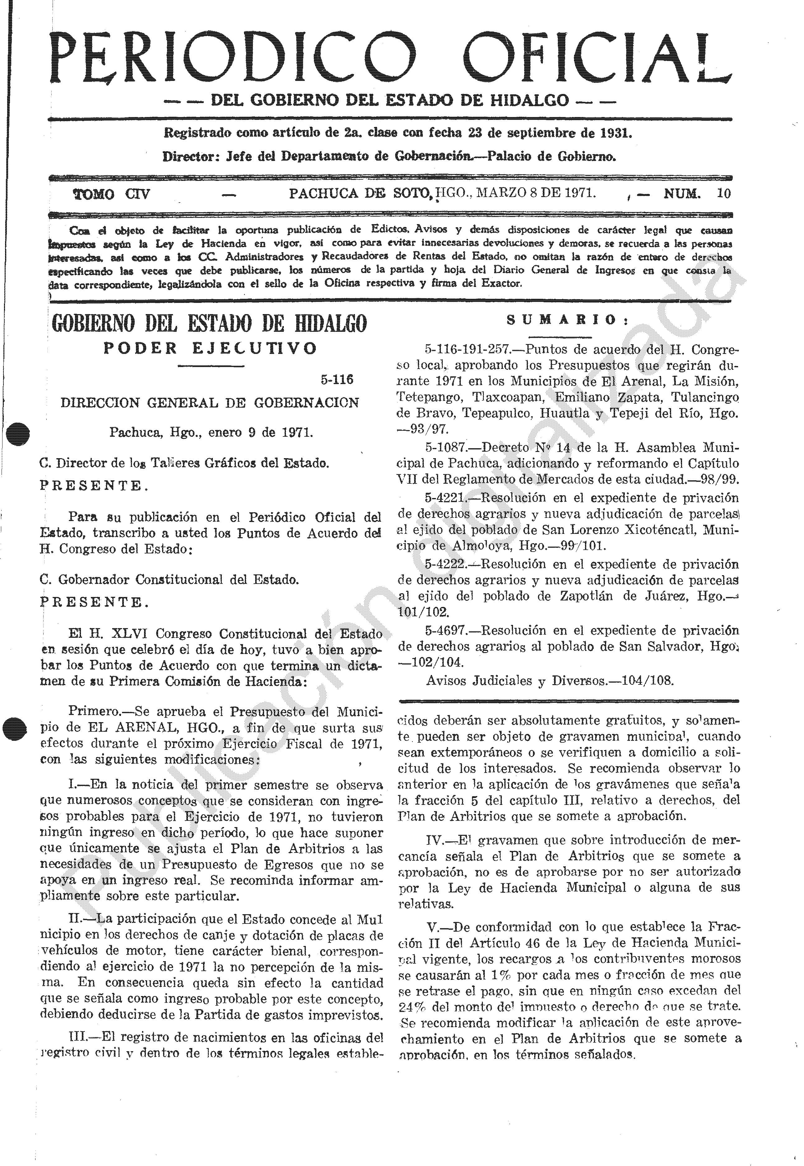 - 5-116-191-257.- Puntos de acuerdo del H. Congreso local, aprobando los Presupuestos que regirán durante 1971 en los Municipios de El Arenal, La Misión, Tetepango, Tlaxcoapan, Emiliano Zapata, Tulancingo de Bravo, Tepeapulco, Huautla y Tepeji del Río, Hgo.