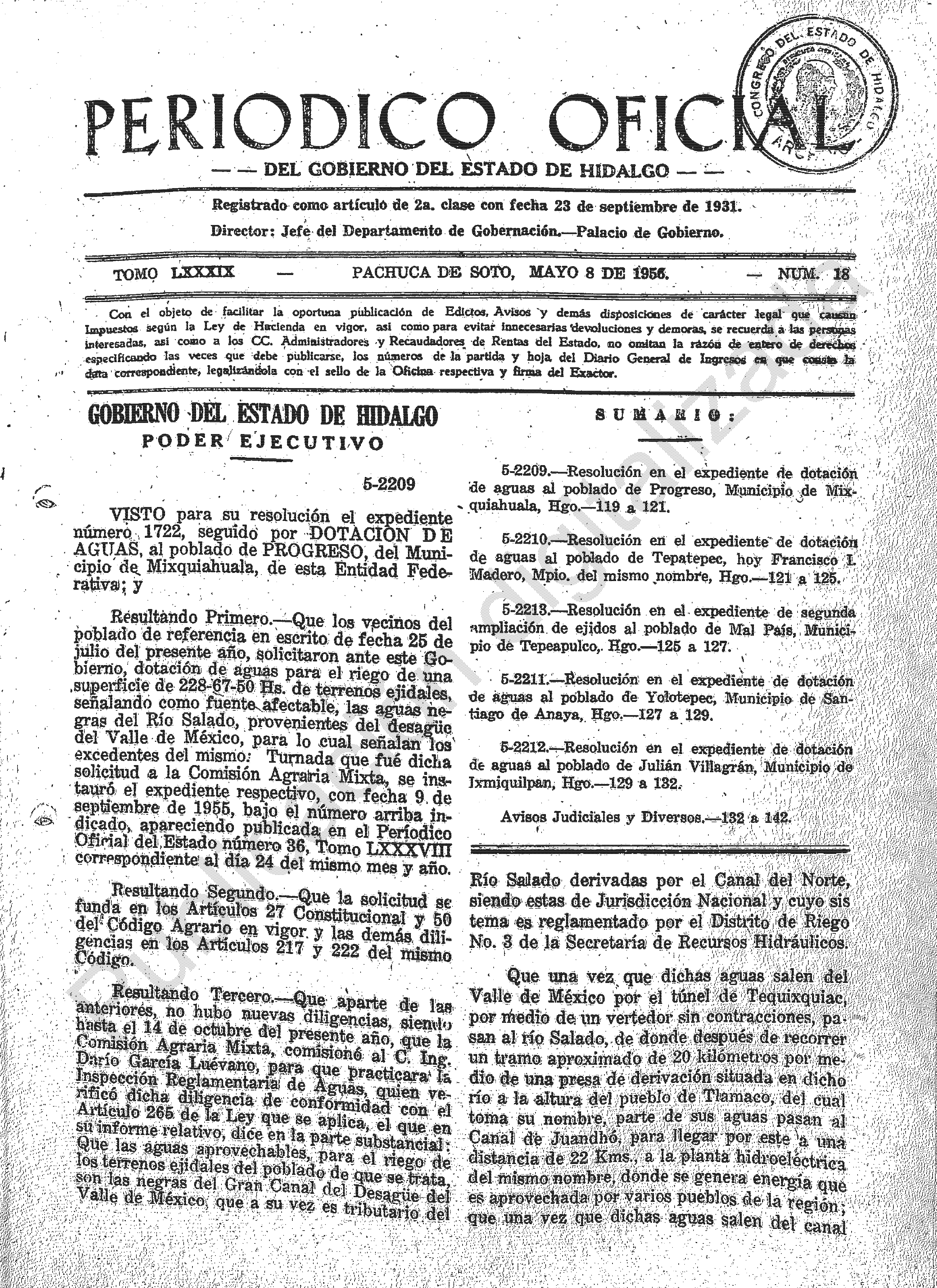 - 5-2209.- Resolución en el expediente de dotación de aguas al poblado de Progreso, Municipio de Mixquiahuala, Hgo.