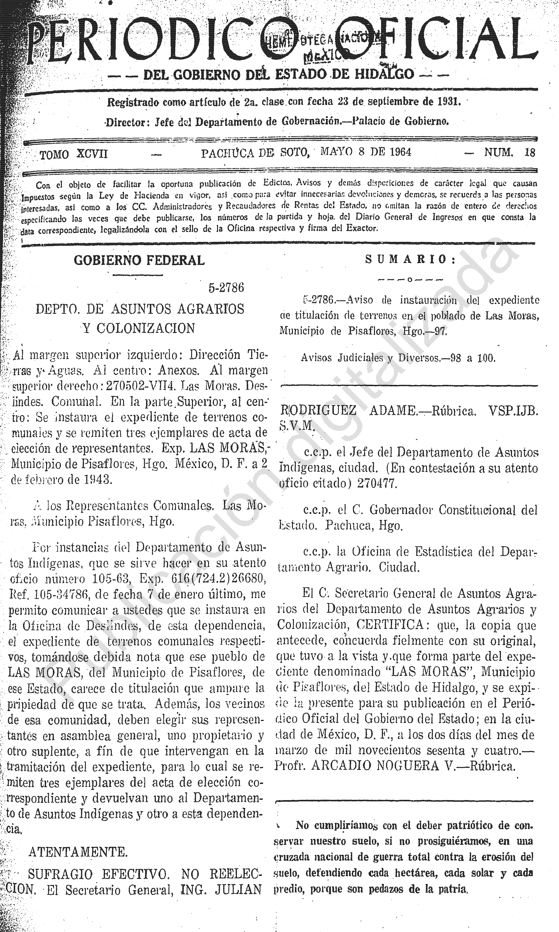 - 5-2786.- Aviso de instauración del expediente de titulación de terrenos en el poblado de Las Moras, Municipio de Pisaflores, Hgo.