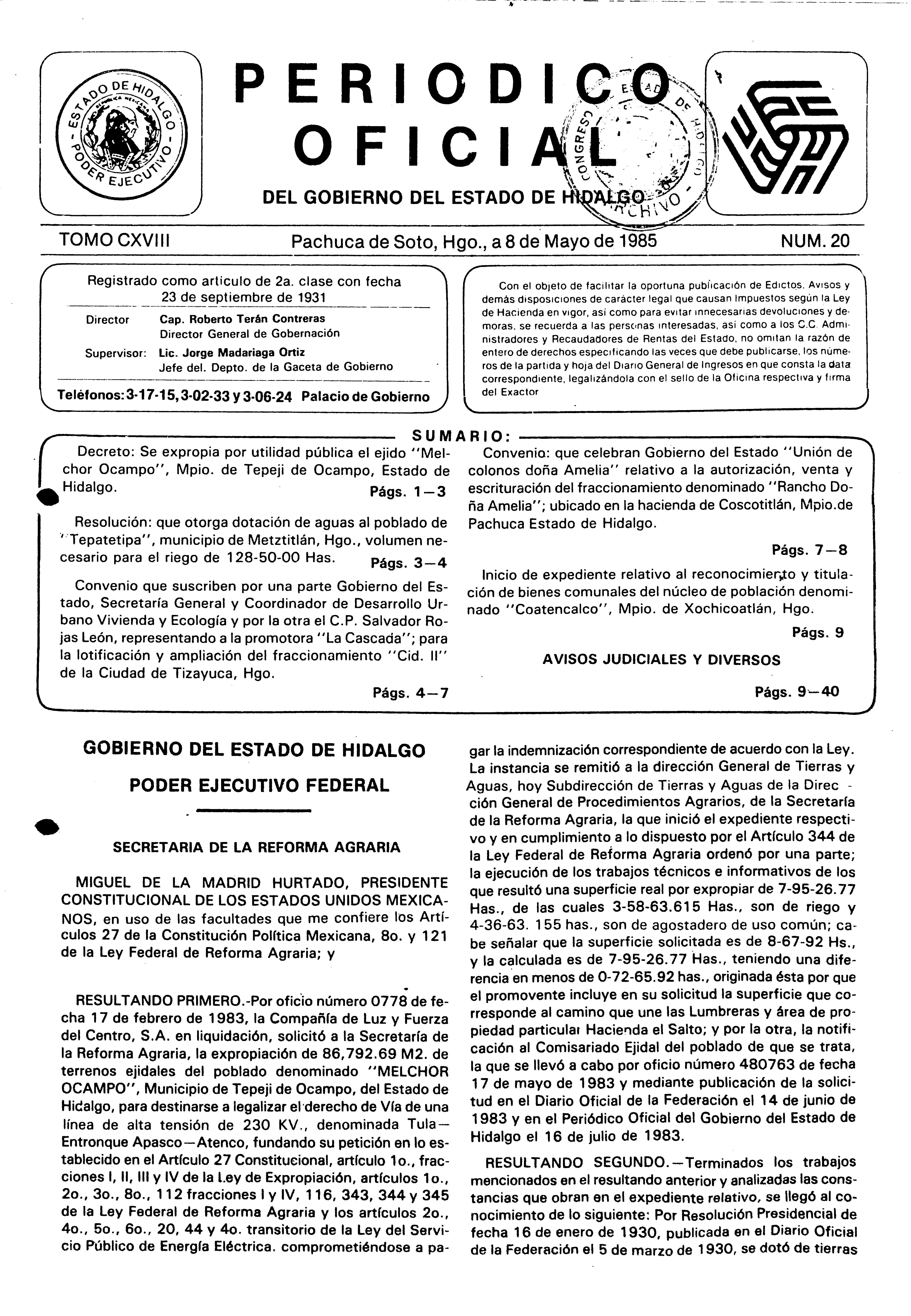 - Decreto: Se expropia por utilidad pública el ejido “Melchor Ocampo”, Mpio. de Tepeji de Ocampo, Estado de Hidalgo.