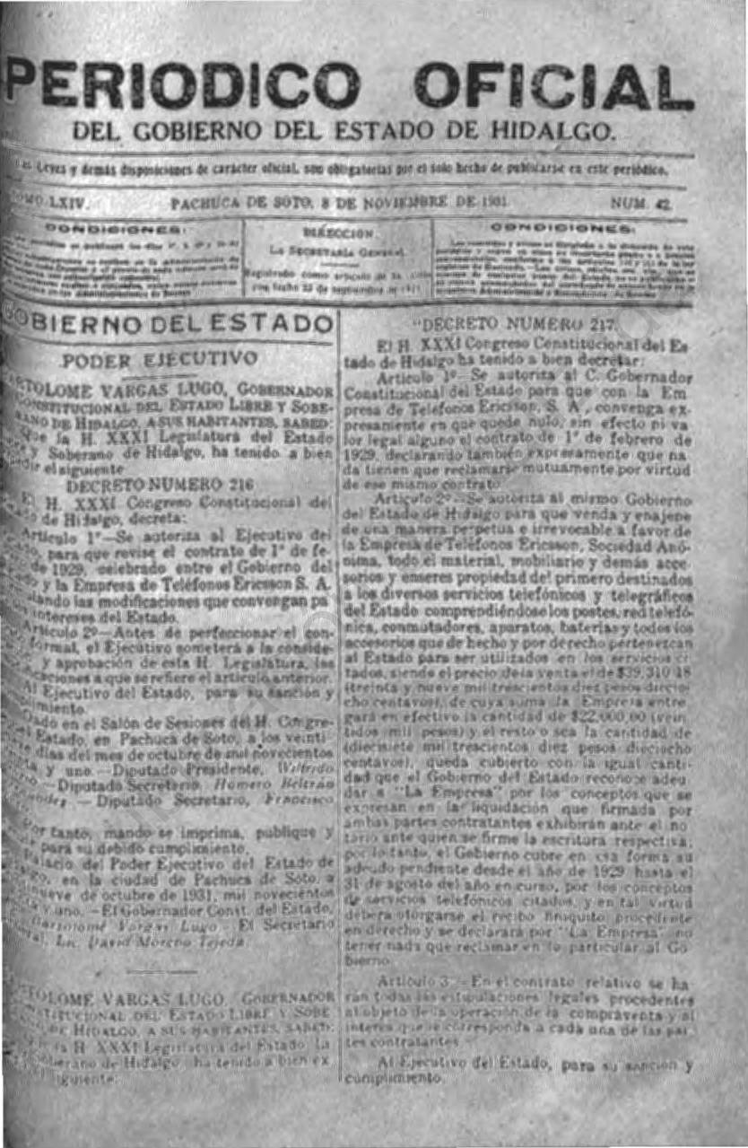 - Decreto Número 217, Se autoriza al C. Gobernador Constitucional del Estado para que con la Empresa de Teléfonos Ericsson, S.A., convenga expresamente en que quede nulo, sin efecto ni valor legal alguno el contrato de 1º de febrero de 1929, declarando también expresamente que nada tienen que reclamarse mutuamente por virtud de ese mismo contrato.