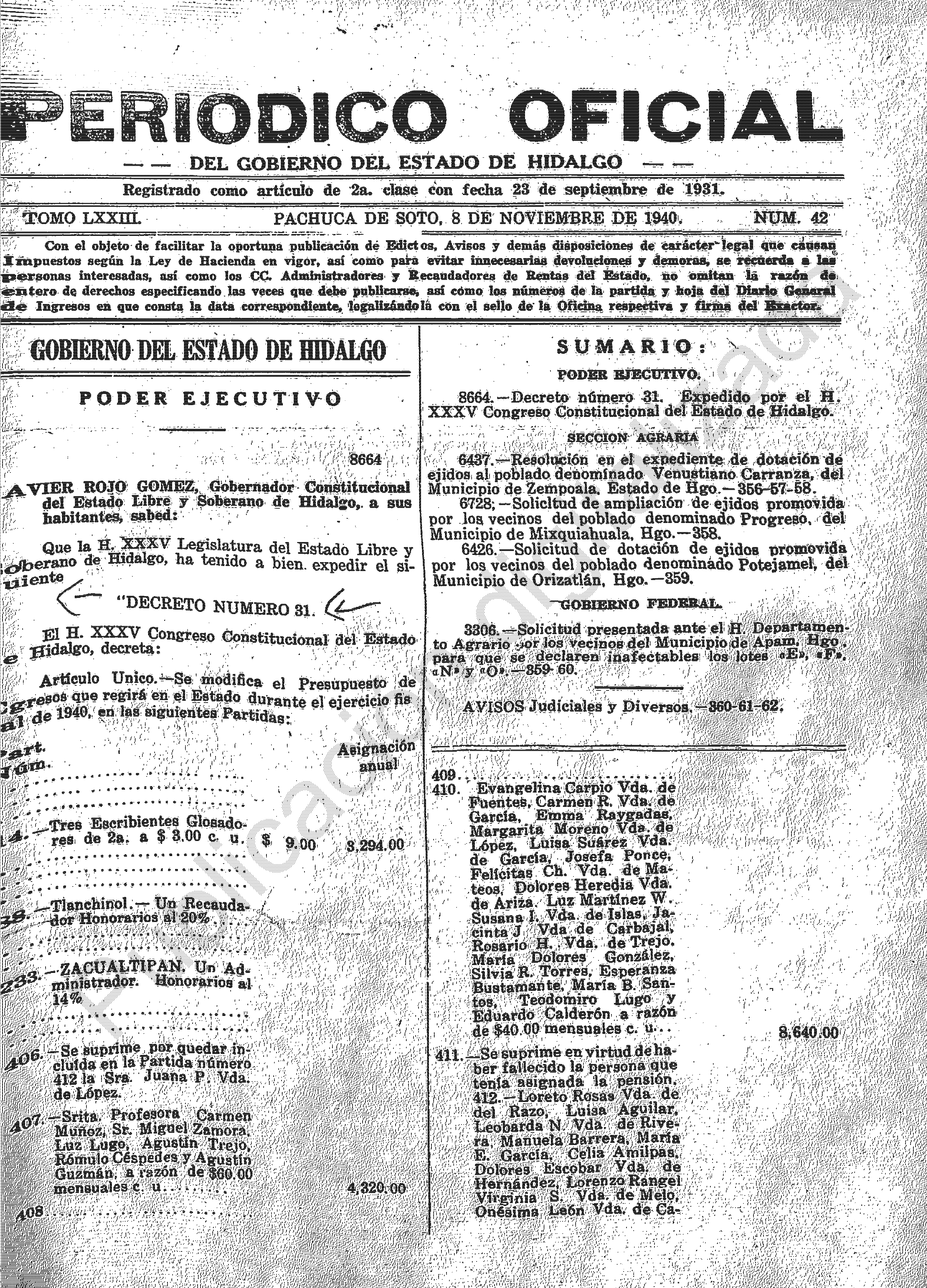 Descargar Periódico Oficial Ordinario 0 del 08 de noviembre de 1940
