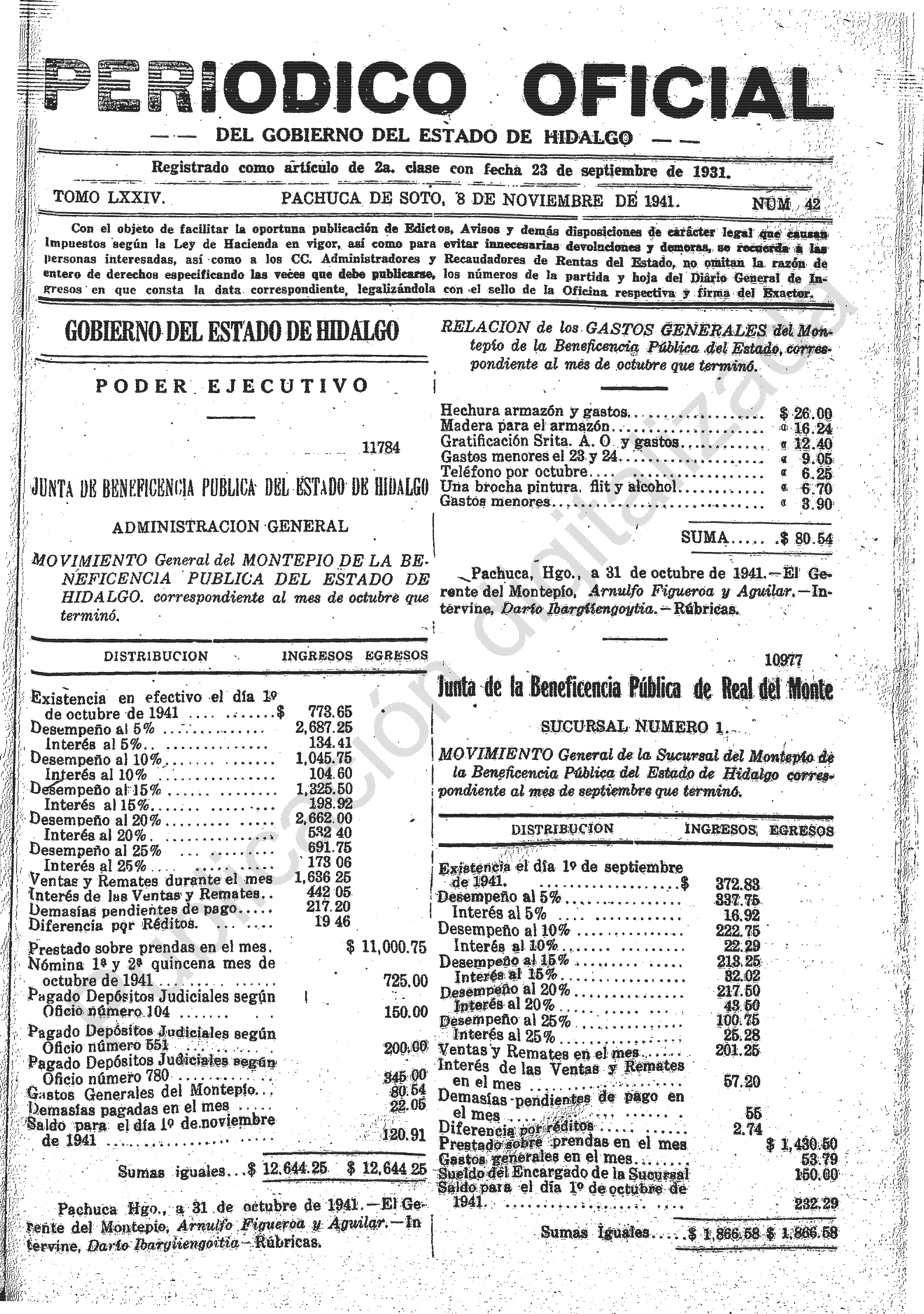 - 11784.- Movimiento General del Montepío de la Beneficencia Pública del Estado de Hidalgo, correspondiente al mes de octubre que terminó.