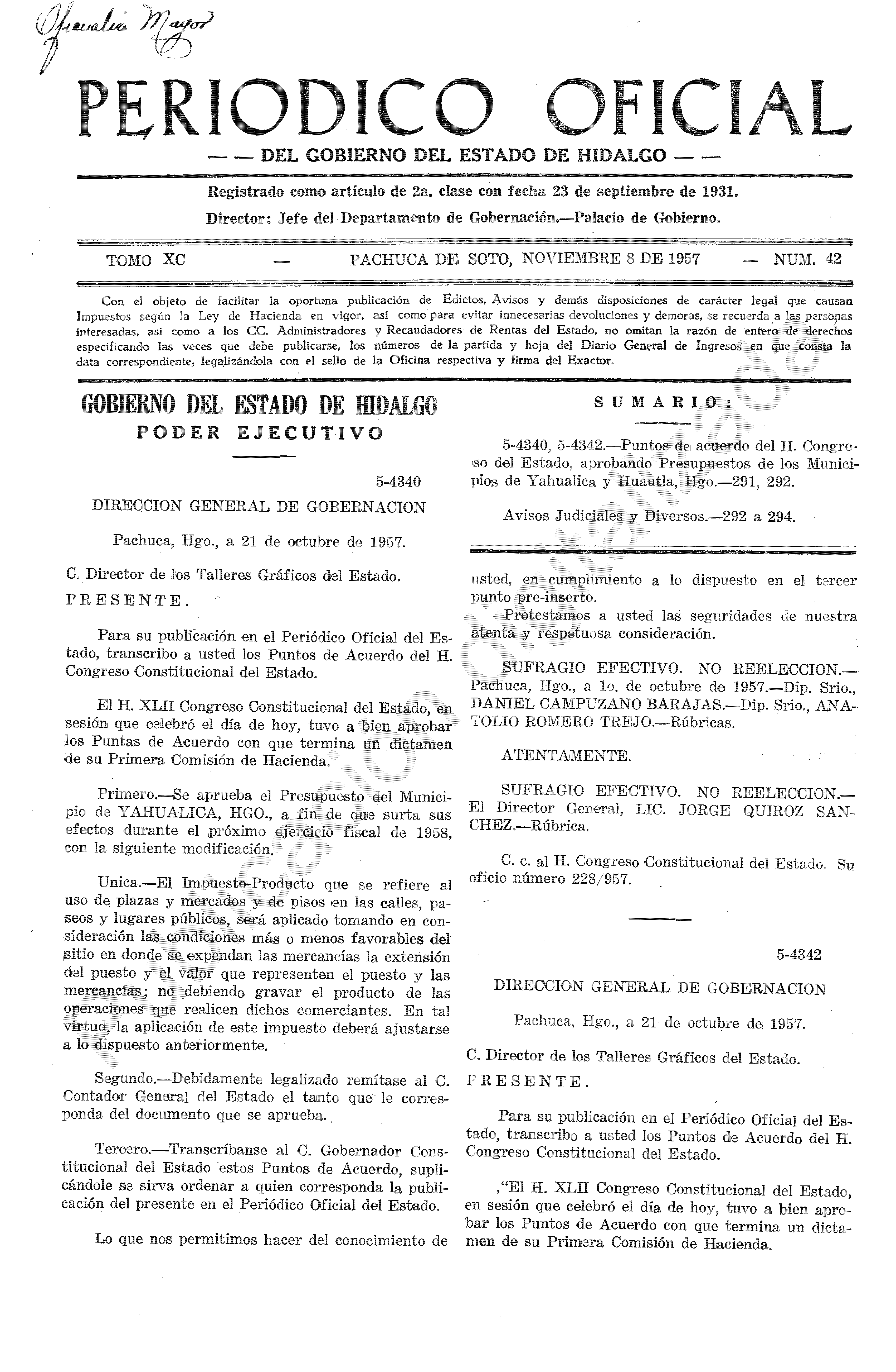- 5-4340, 5-4342.- Puntos de acuerdo del H. Congreso del Estado, aprobando Presupuestos de los Municipios de Yahualica y Huautla, Hgo.