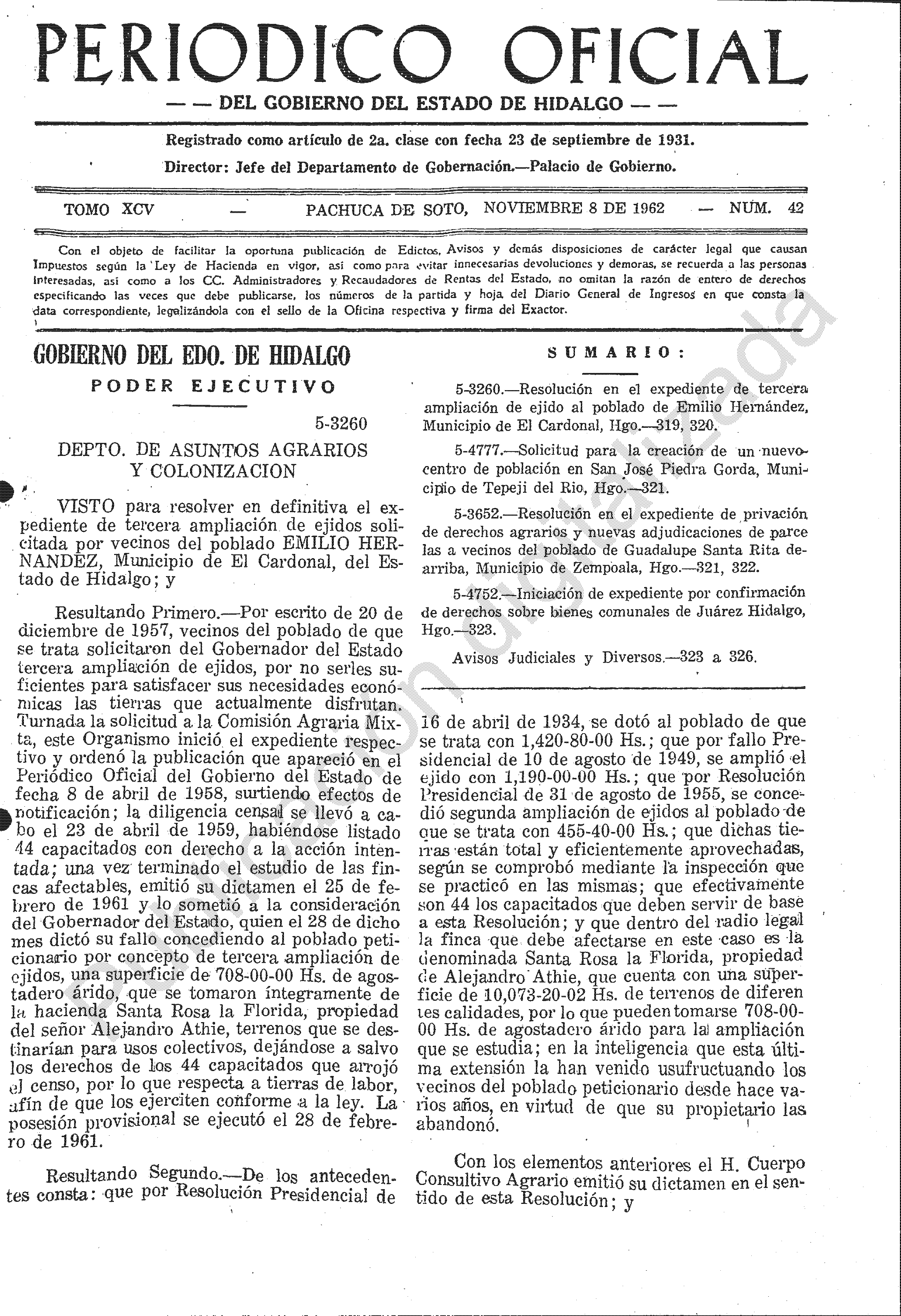 • 5-3260.- Resolución en el expediente de tercera ampliación de ejido al poblado de Emilio Hernández, Municipio de El Cardonal, Hgo.