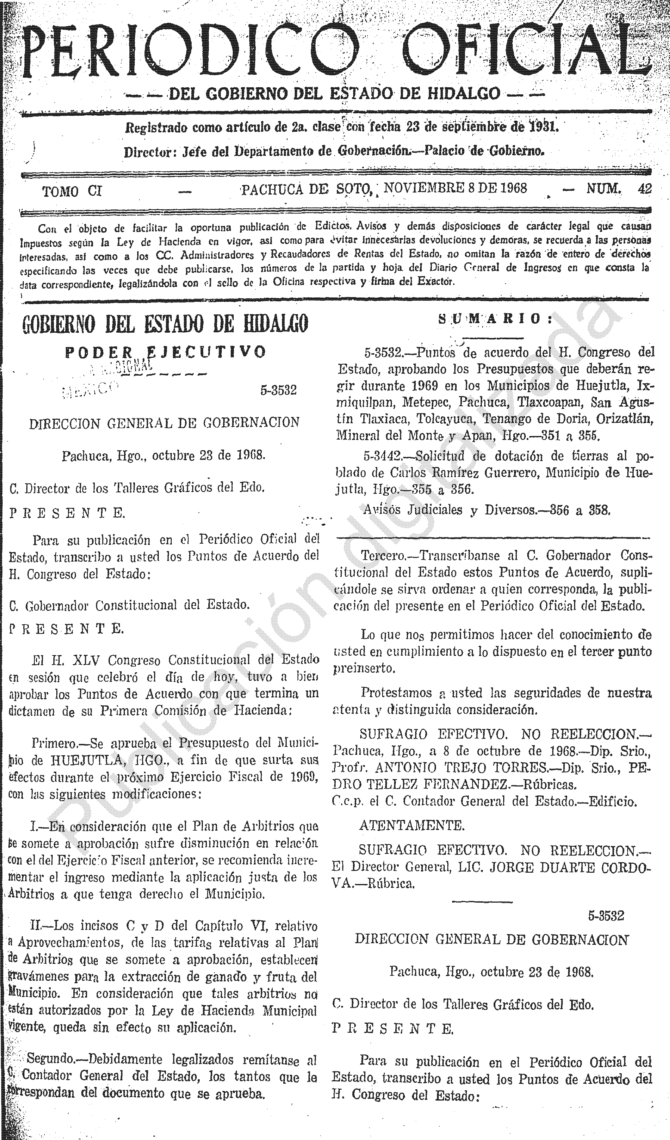 • 5-3532.- Puntos de acuerdo del H. Congreso del Estado, aprobando los Presupuestos que deberán regir durante 1969 en los Municipios de Huejutla, Ixmiquilpan, Metepec, Pachuca, Tlaxcoapan, San Agustín Tlaxiaca, Tolcayuca, Tenango de Doria, Orizatlán, Mineral del Monte y Apan, Hgo.