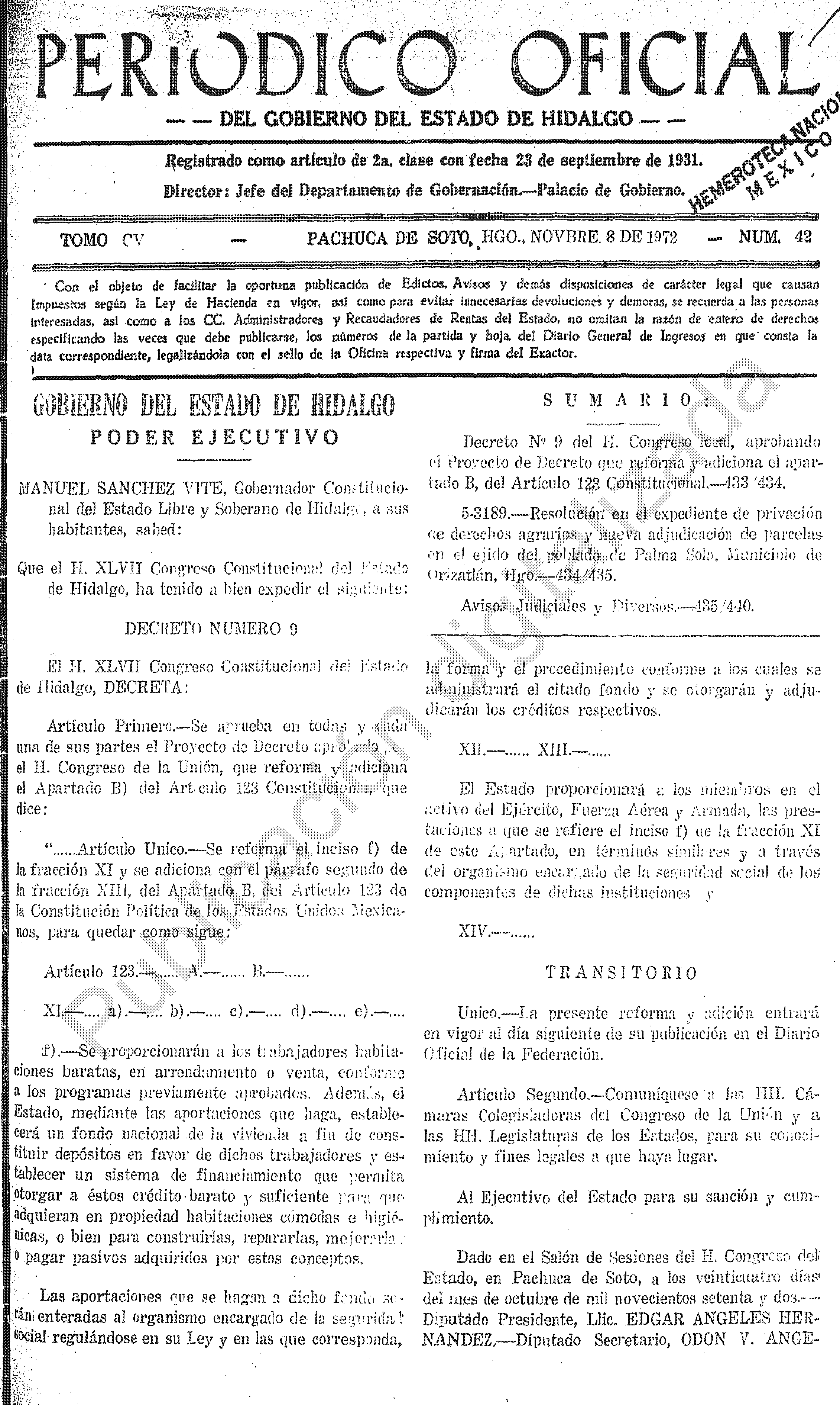 - Decreto No. 9 del H. Congreso local, aprobando el Proyecto de Decreto que reforma y adiciona el apartado B, del Artículo 123 Constitucional.
