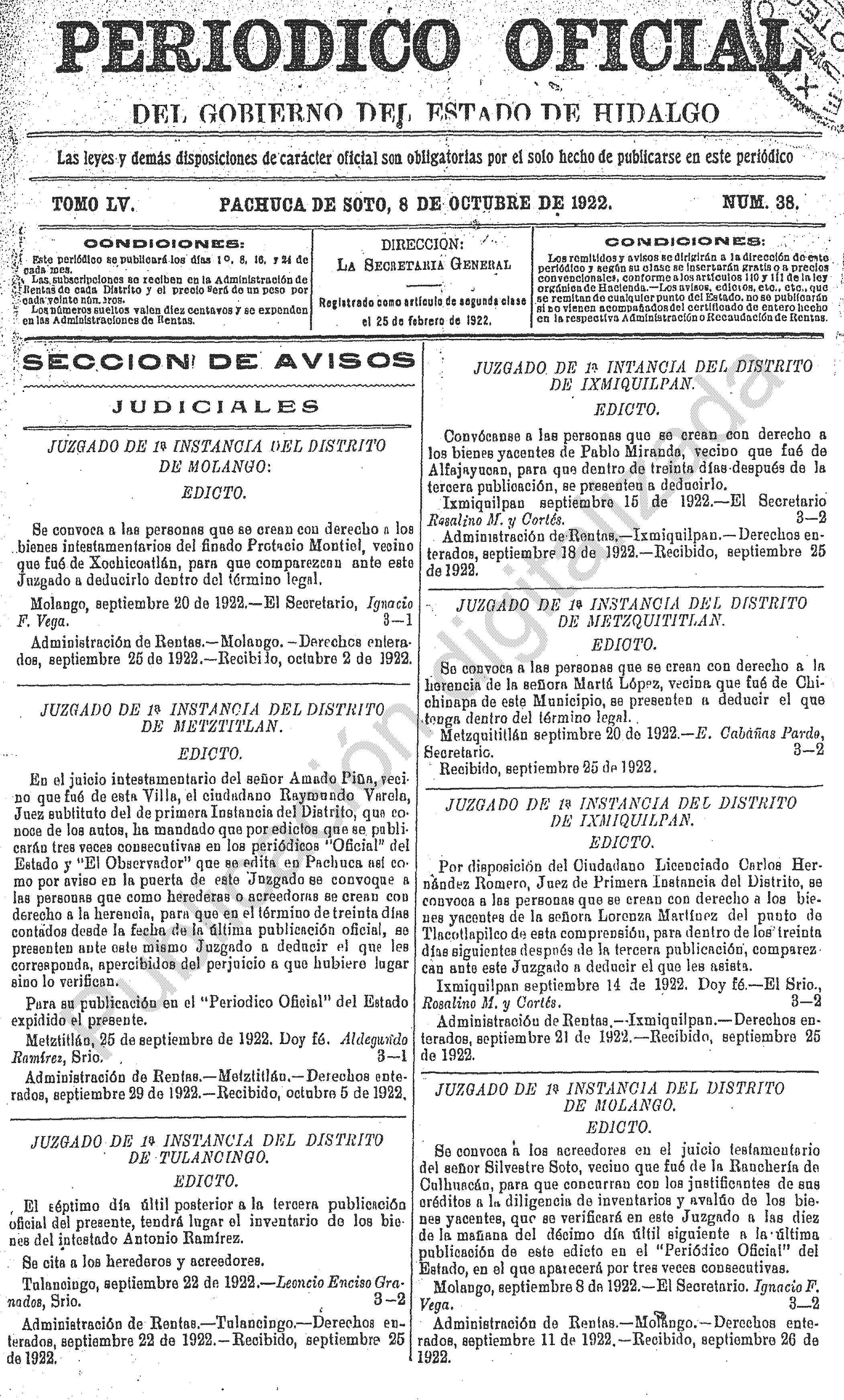 Descargar Periódico Oficial Ordinario 0 del 08 de octubre de 1922El portal web del Periódico Oficial del Estado de hidalgo es el único medio de difusión oficial del Gobierno del Estado de Hidalgo