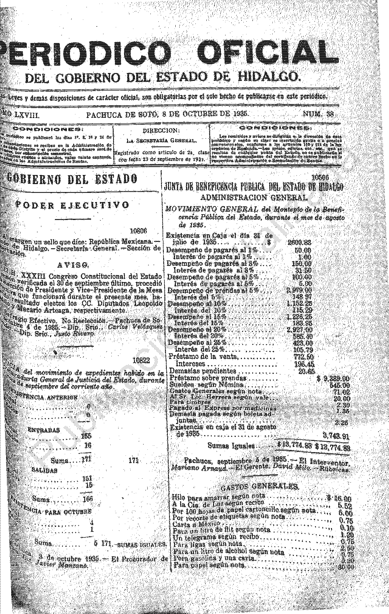 - 10506.- Junta de Beneficencia Pública del Estado de Hidalgo, Movimiento General del Montepío de la Beneficencia Pública del Estado, durante el mes de agosto de 1935.