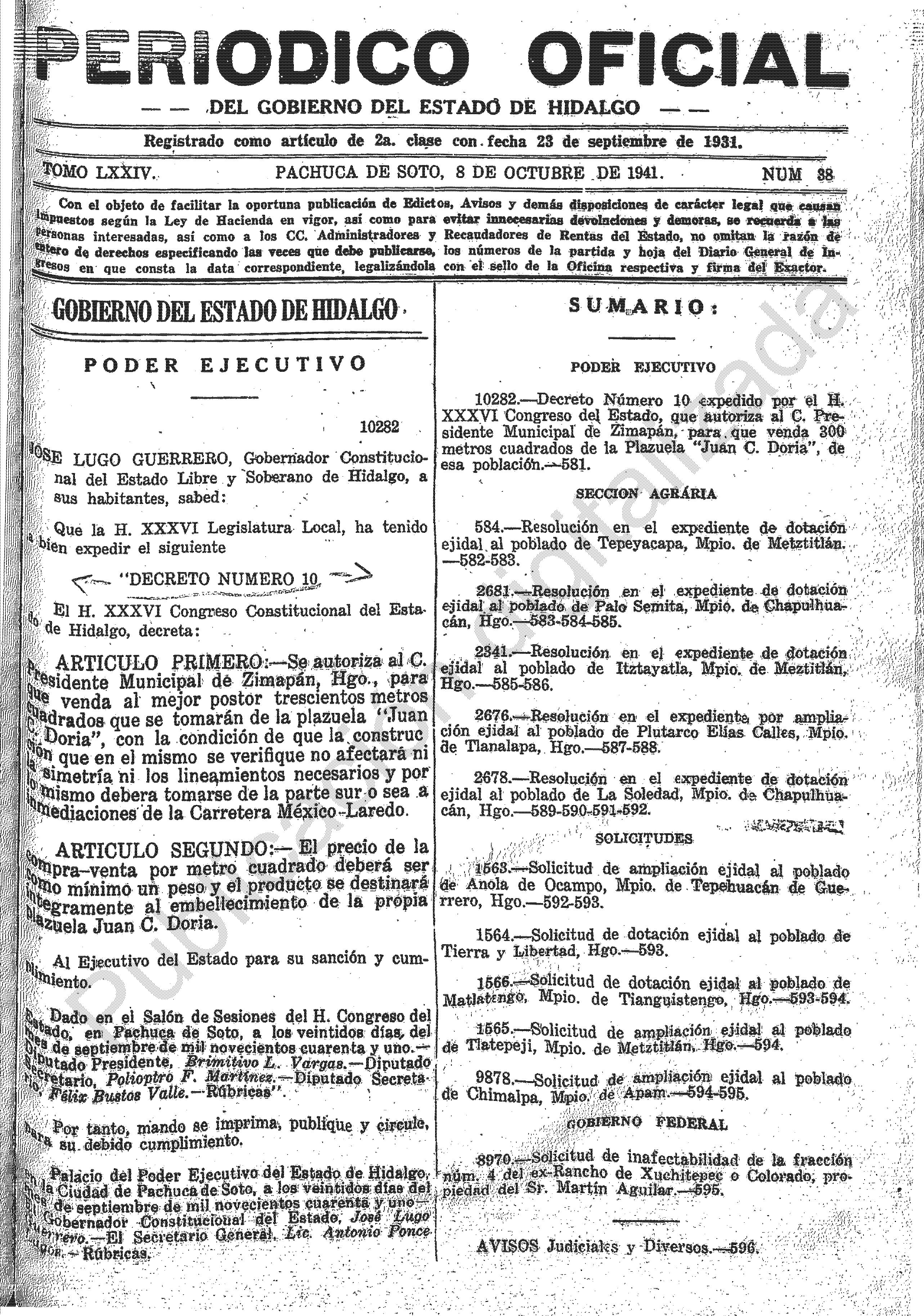- 10282.- Decreto Número10 expedido por el H. XXXVI Congreso del Estado, que autoriza al C. Presidente Municipal de Zimapán, para que venda 300 metros cuadrados de la Plazuela “Juan C. Doria”, de esa población.