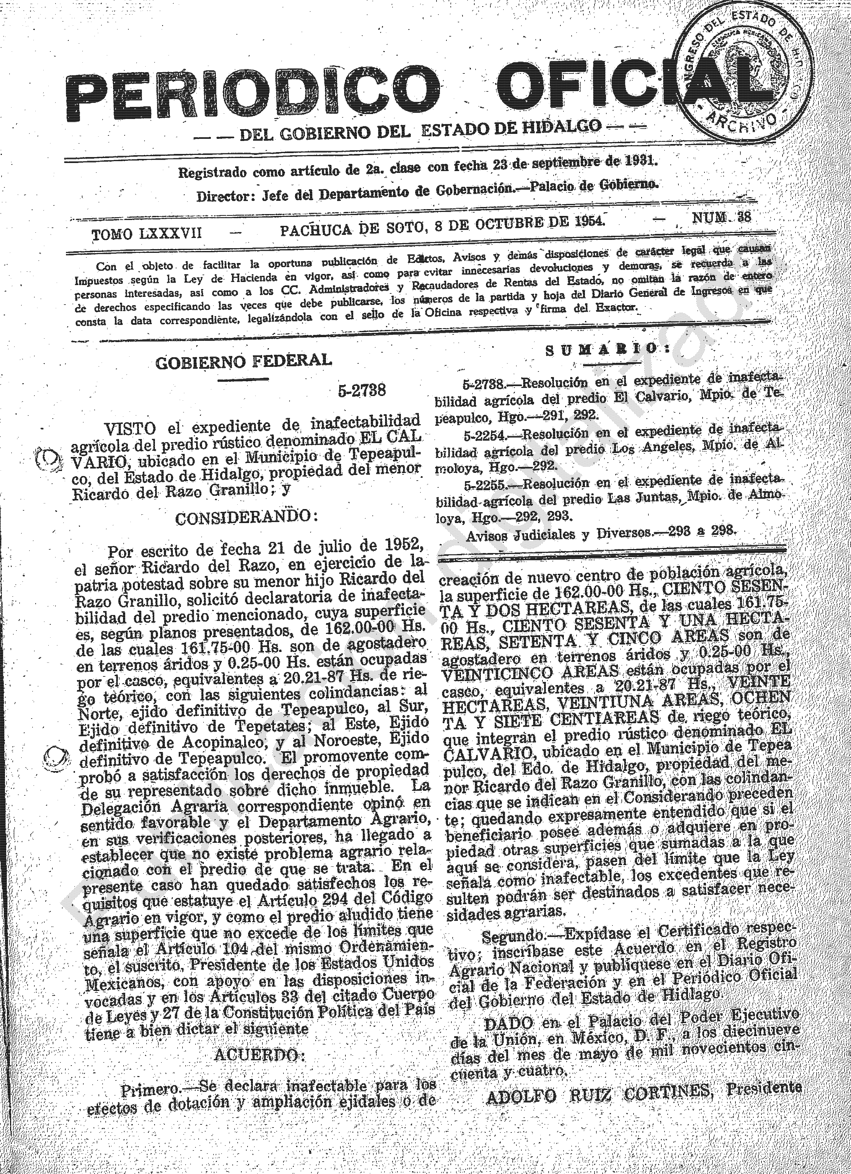 Descargar Periódico Oficial Ordinario 0 del 08 de octubre de 1954