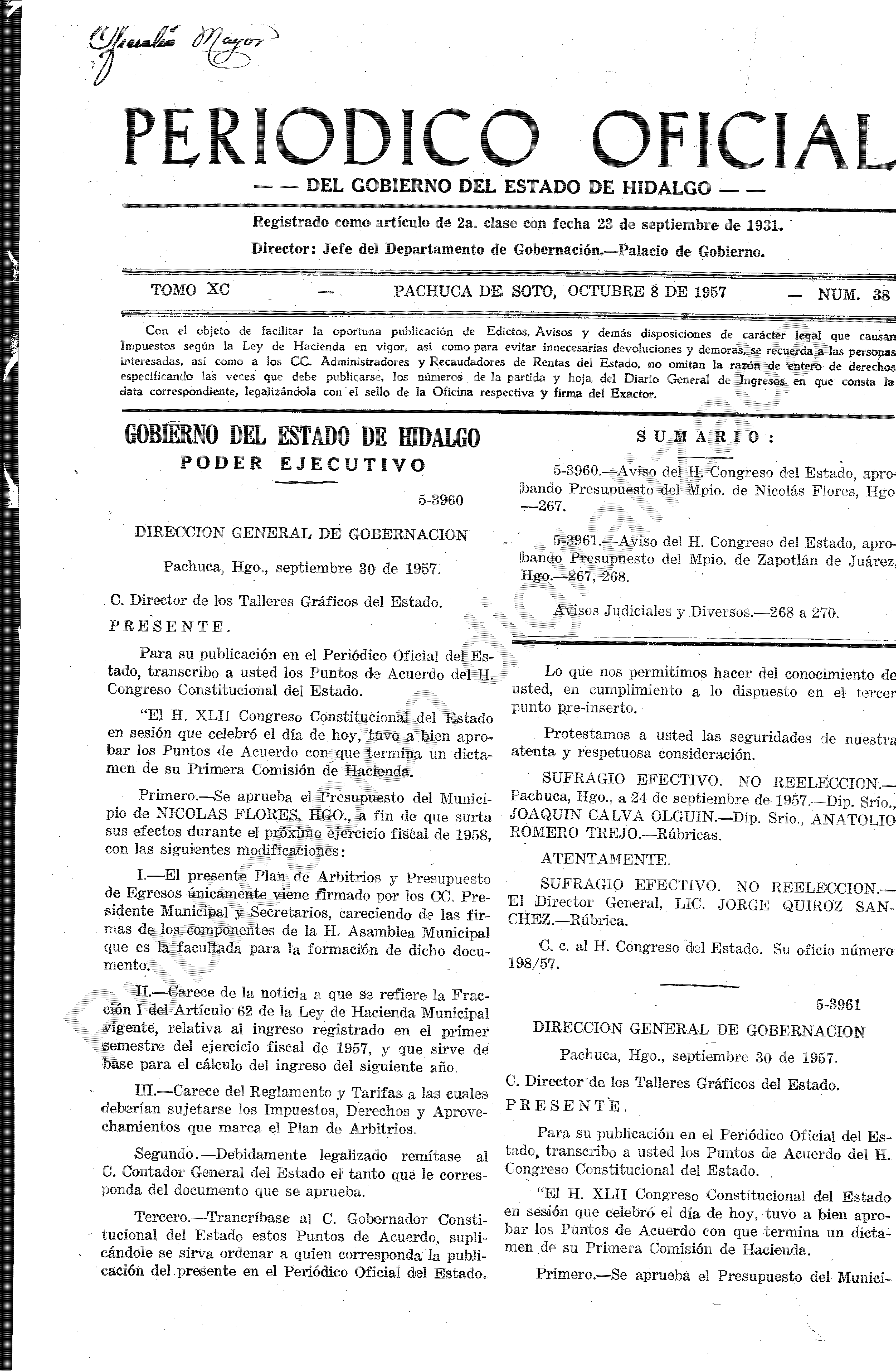 • 5-3960.- Aviso del H. Congreso del Estado, aprobando Presupuesto del Mpio. de Nicolás Flores, Hgo.