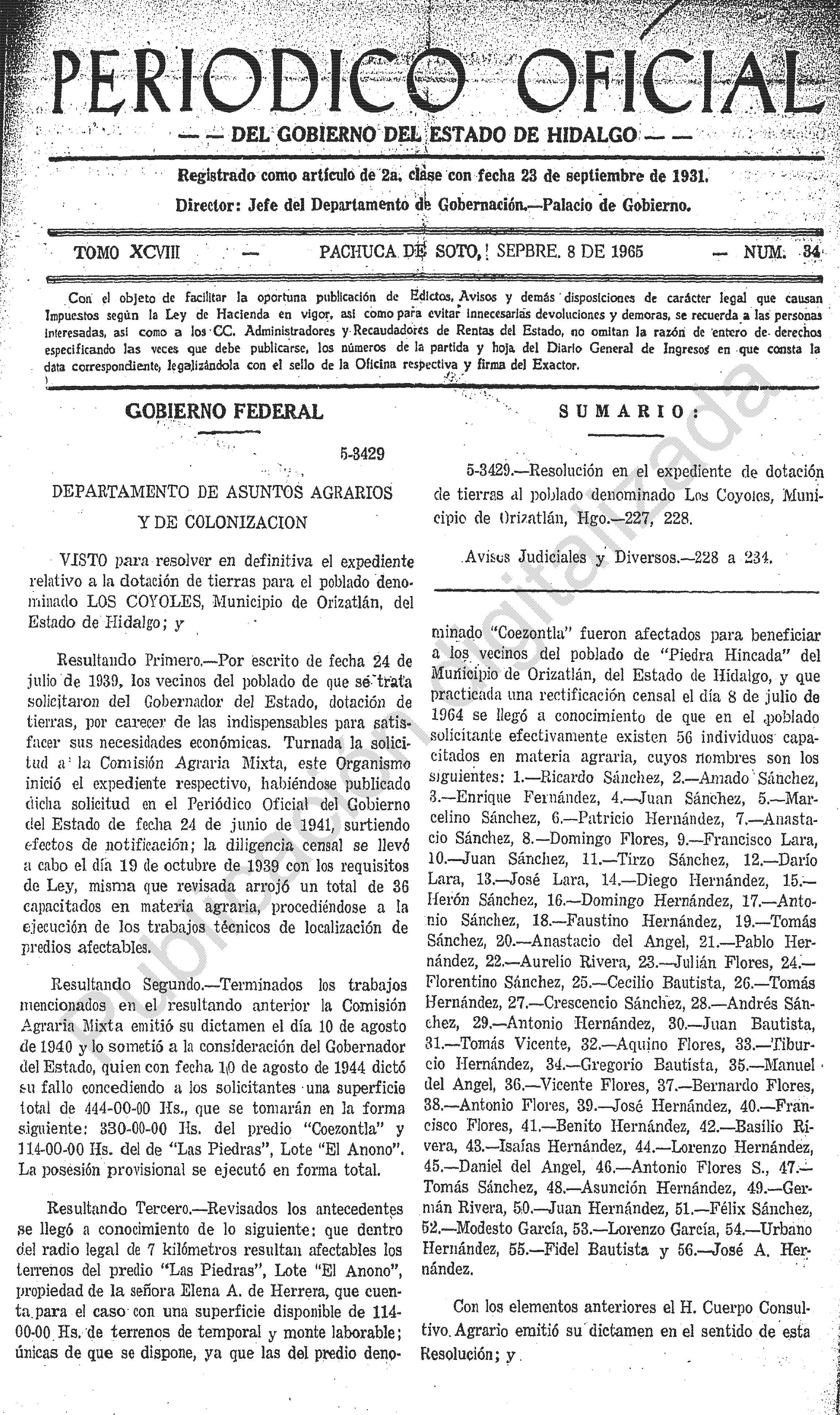 - 5-3429.- Resolución en el expediente de dotación de tierras al poblado denominado Los Coyotes, Municipio de Orizatlán, Hgo.