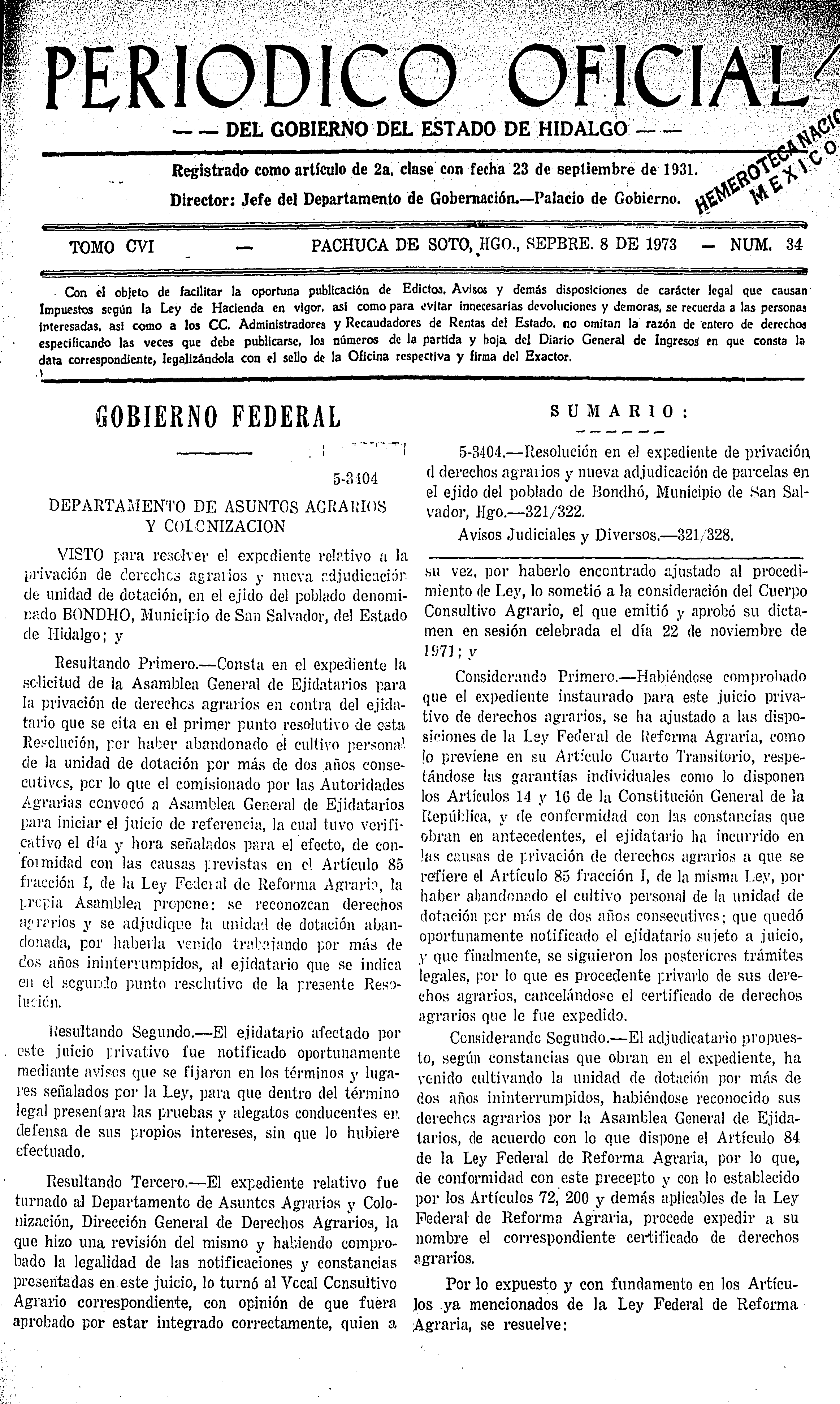 - 5-3404.- Resolución en el expediente de privación de derechos agrarios y nueva adjudicación de parcelas en el ejido del poblado de Bondhó, Municipio de San Salvador, Hgo.