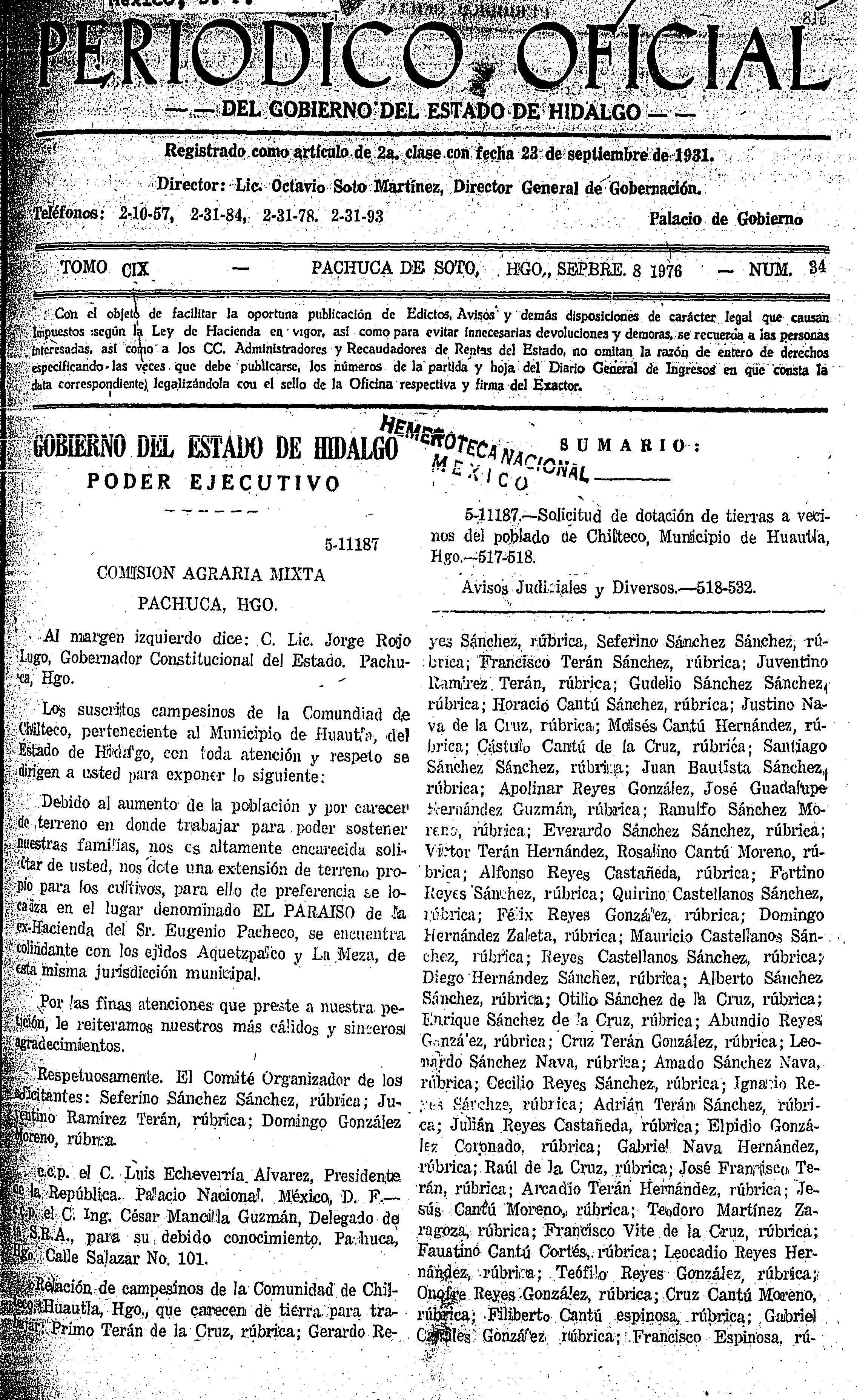 • 5-11187.- Solicitud de dotación de tierras a vecinos del poblado de Chilteco, Municipio de Huautla, Hgo.