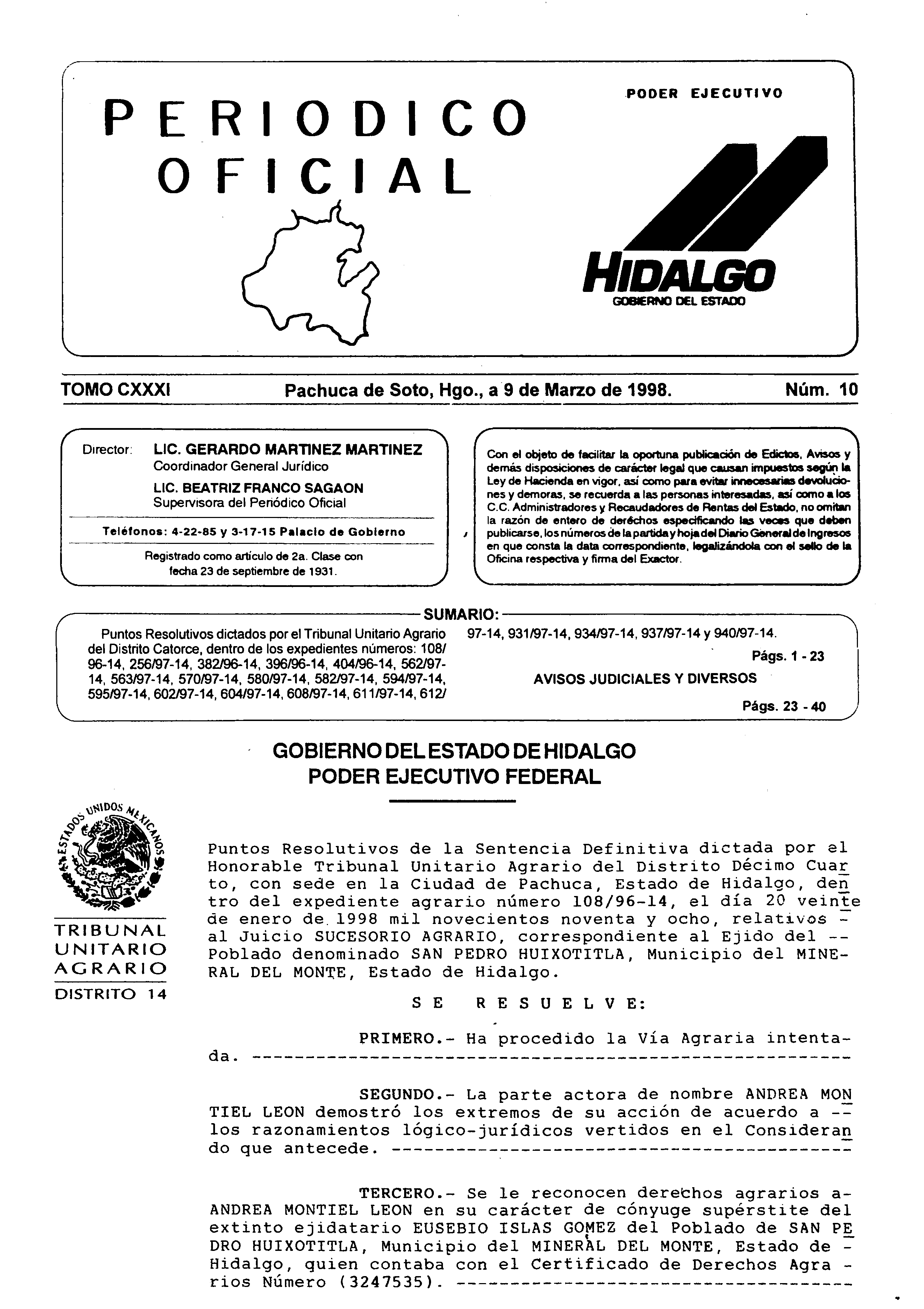 - Puntos Resolutivos dictados por el Tribunal Unitario Agrario del Distrito Catorce, dentro de los expedientes números: 108/96-14, 256/97-14, 382/96-14, 396/96-14, 404/96-14, 562/97-14, 563/97-14, 570/97-14, 580/97-14, 582/97-14, 594/97-14, 595/97-14, 602/97-14, 604/97-14, 608/97-14, 611/97-14, 612/97-14, 931/97-14, 934/97-14, 937/97-14 y 940/97-14.
