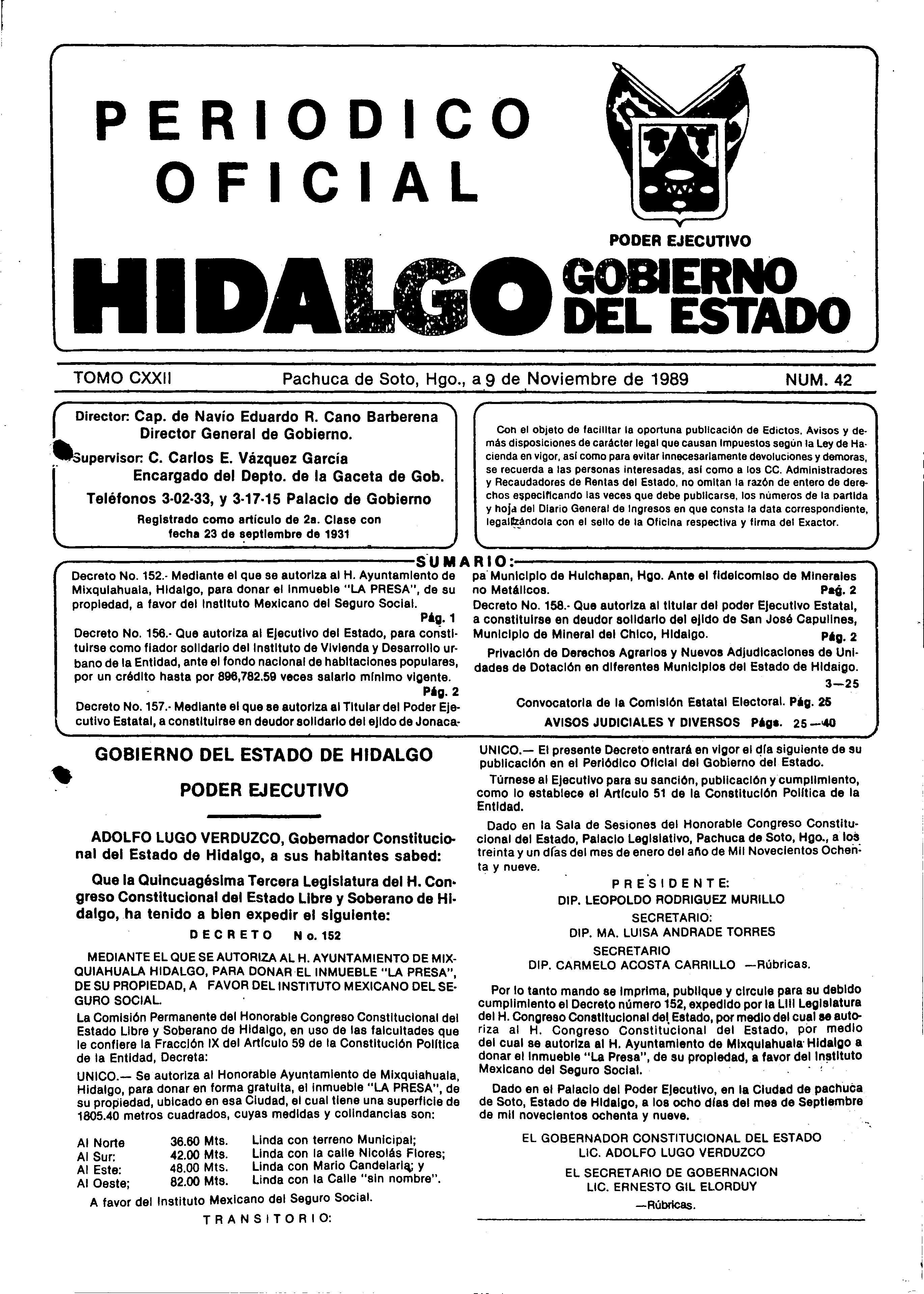 - Decreto No. 152.- Mediante el que se autoriza al H. Ayuntamiento de Mixquiahuala, Hidalgo, para donar el inmueble “LA PRESA”, de su propiedad, a favor del Instituto Mexicano del Seguro Social.
