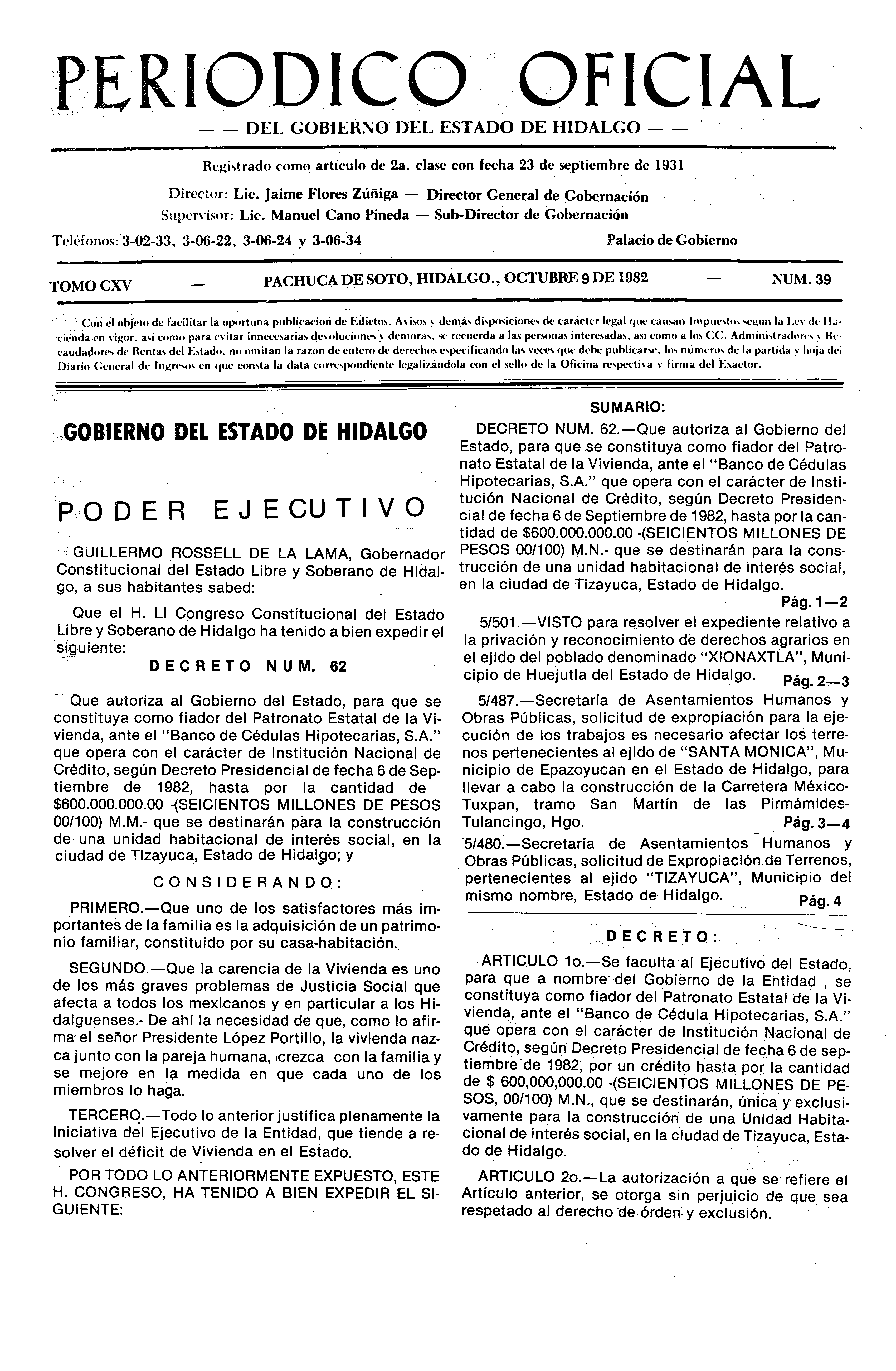 - Decreto Núm. 62.- Que autoriza al Gobierno del Estado, para que se constituya como fiador del Patronato Estatal de la Vivienda, ante el “Banco de Cédulas Hipotecarias, S.A.” que opera con el carácter de Institución Nacional de Crédito, según Decreto Presidencialde fecha 6 de Septiembre de 1982, hasta por la cantidad de $600,000,000.00 (SEICIENTOS MILLONES DE PESOS 00/100 M. N.) que se destinarán para la construcción de una unidad habitacional de interés social, en la ciudad de Tizayuca, Estado de Hidalgo.