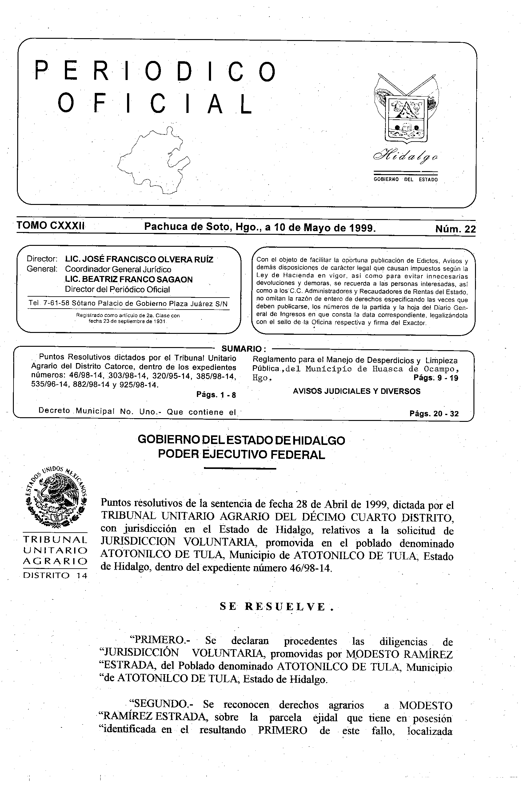 Descargar Periódico Oficial Ordinario 0 del 10 de mayo de 1999