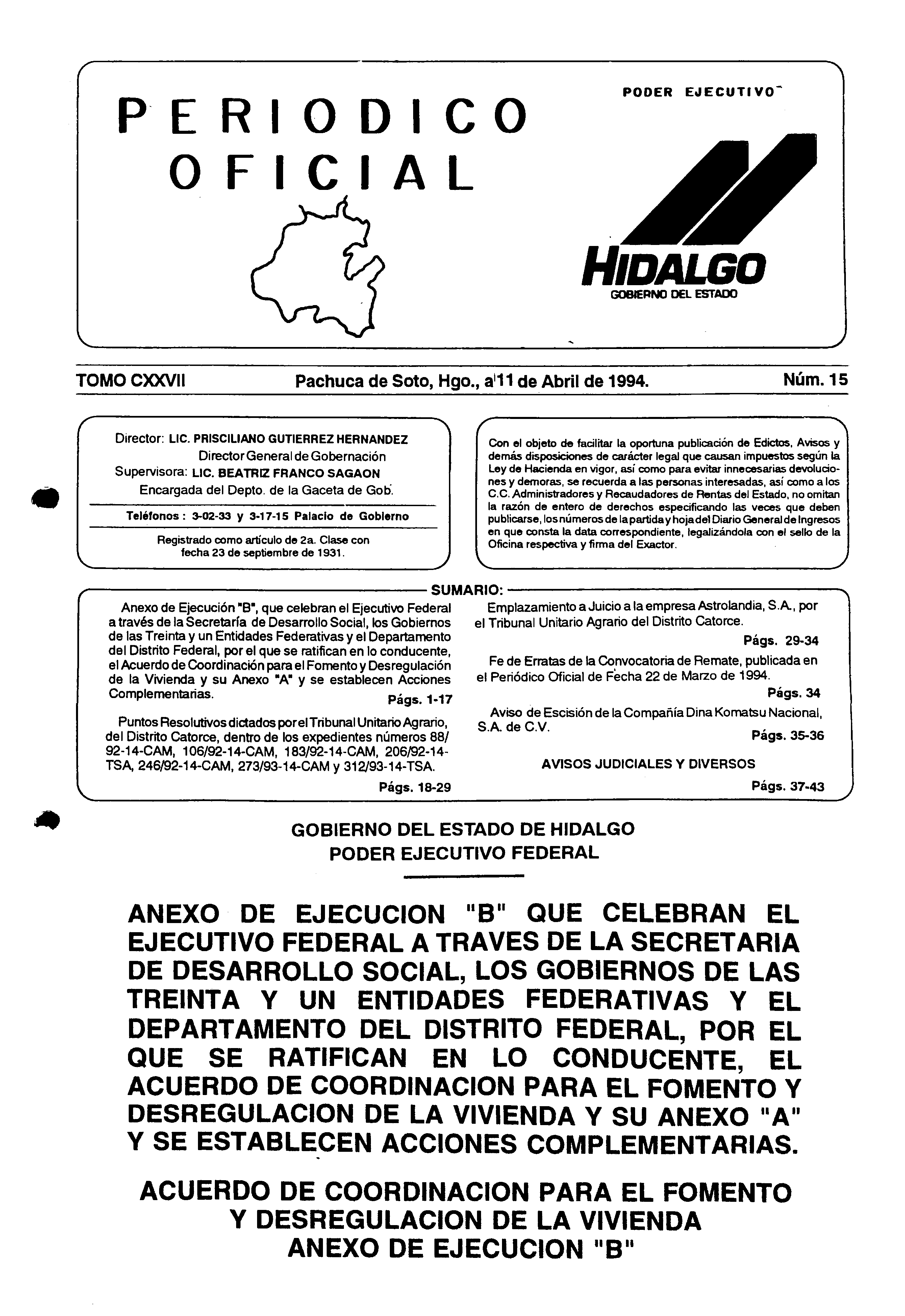 Periódico Oficial Ordinario 0 del 11 de abril de 1994