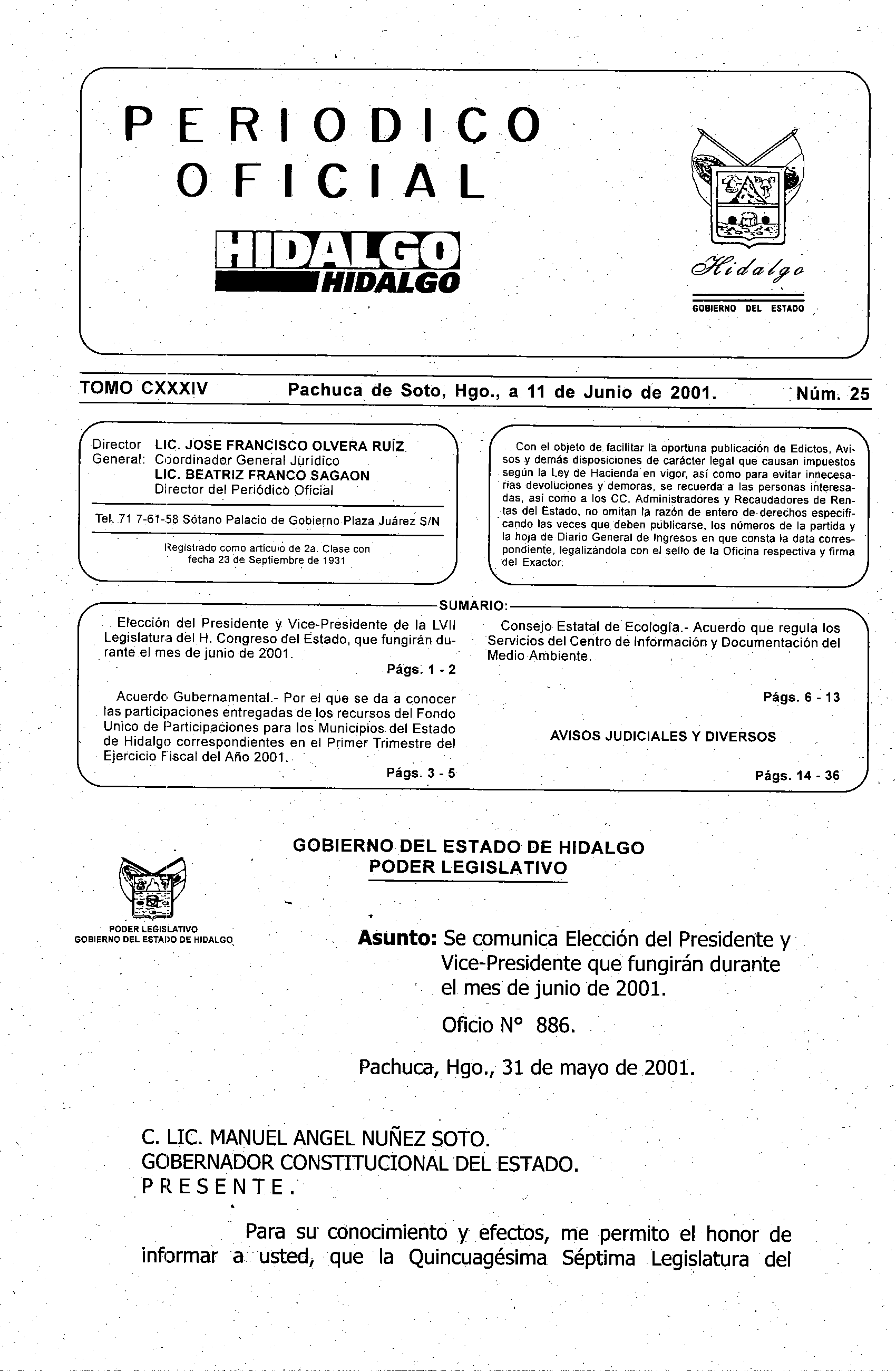 Periódico Oficial Ordinario 0 del 11 de junio de 2001