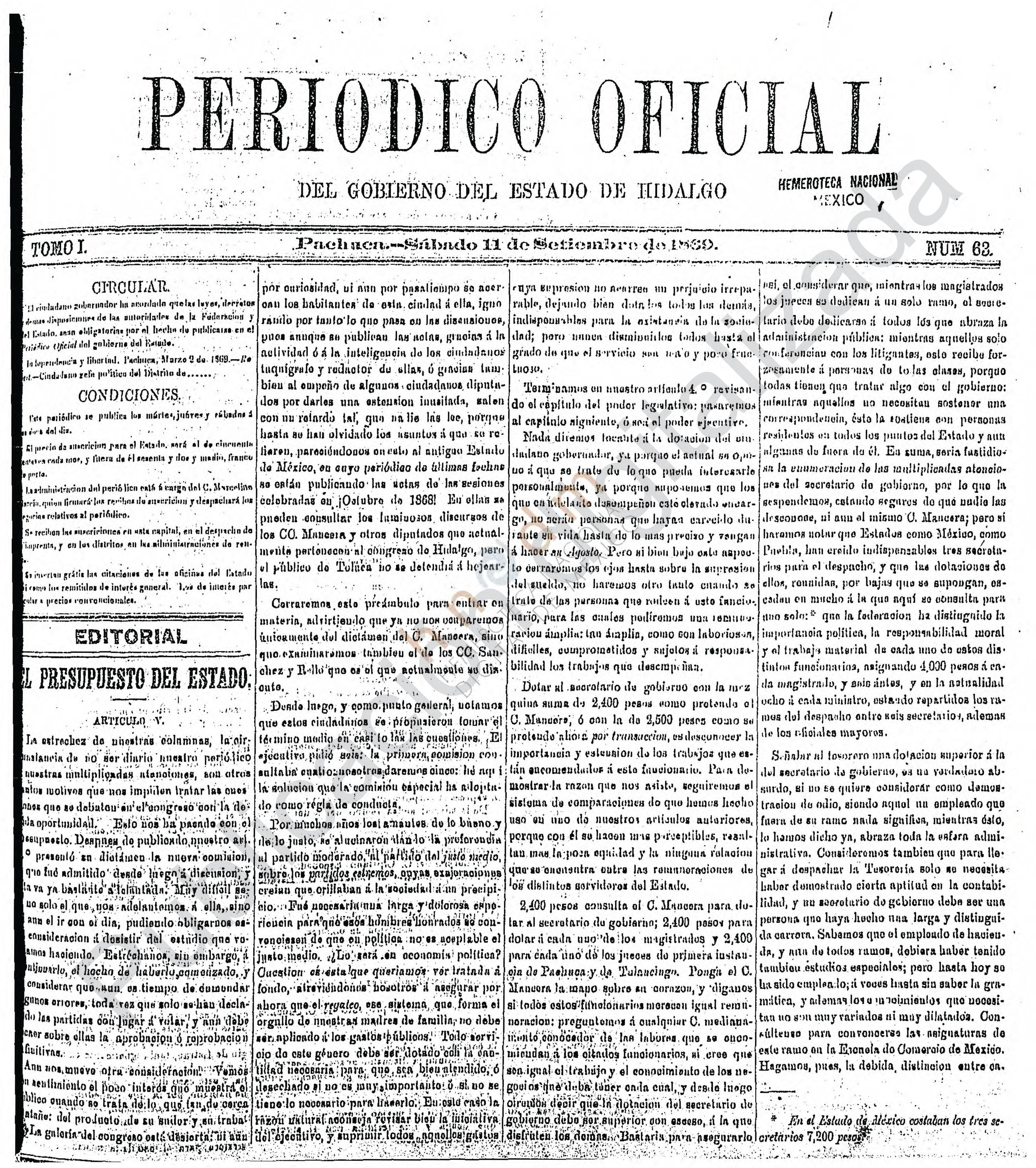 Descargar Periódico Oficial Ordinario 0 del 11 de septiembre de 1869El portal web del Periódico Oficial del Estado de hidalgo es el único medio de difusión oficial del Gobierno del Estado de Hidalgo