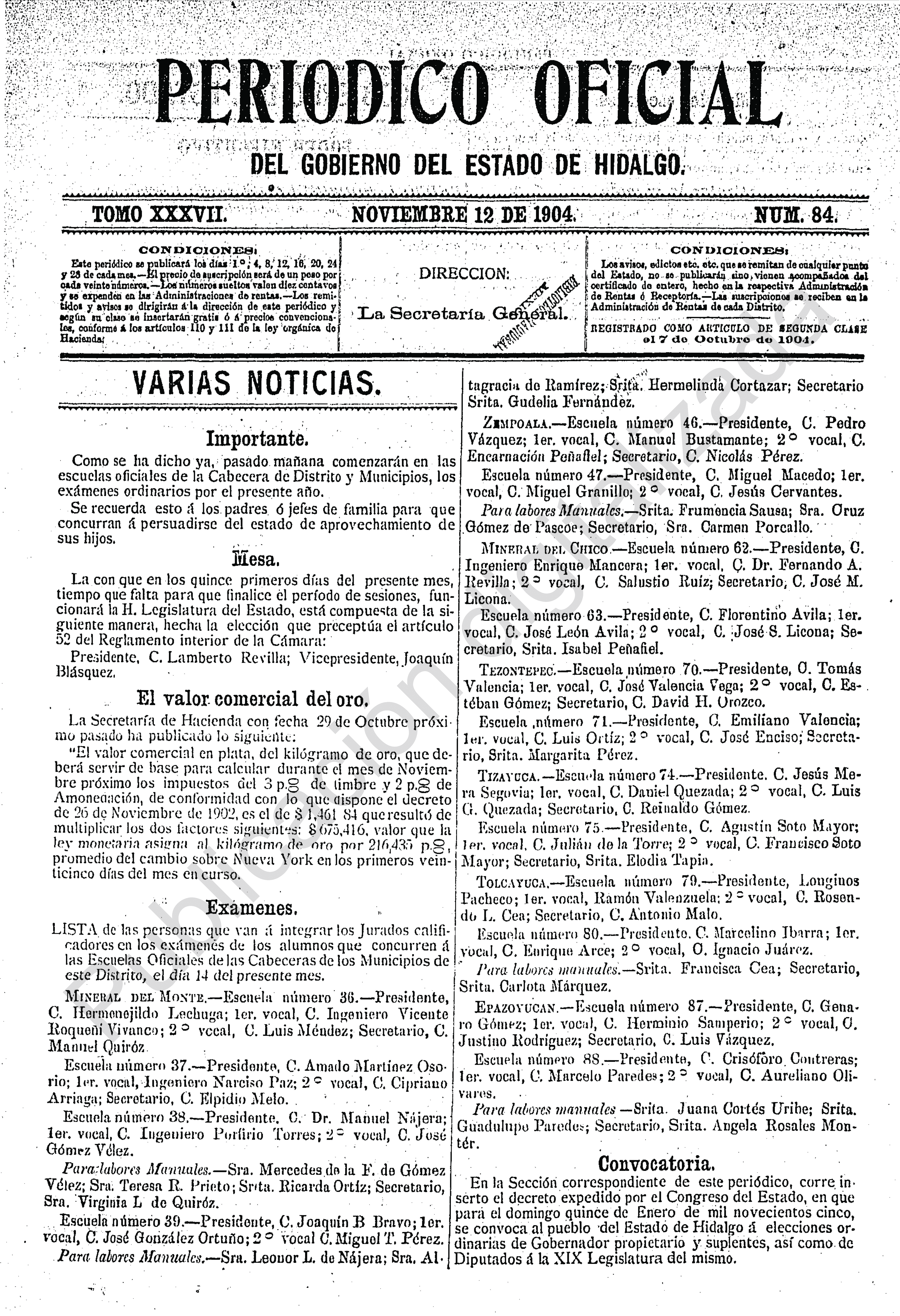 - Pedro L. Rodríguez, Gobernador Constitucional del Estado de hidalgo, decreto número 832, por el que se informa que para el domingo quince de enero de mil novecientos cinco, se convoca al pueblo del Estado de Hidalgo a elecciones ordinarias de Gobernador propietario y suplentes, así como de Diputados a la XIX Legislatura, sujetándose en ellas a las disposiciones legales.