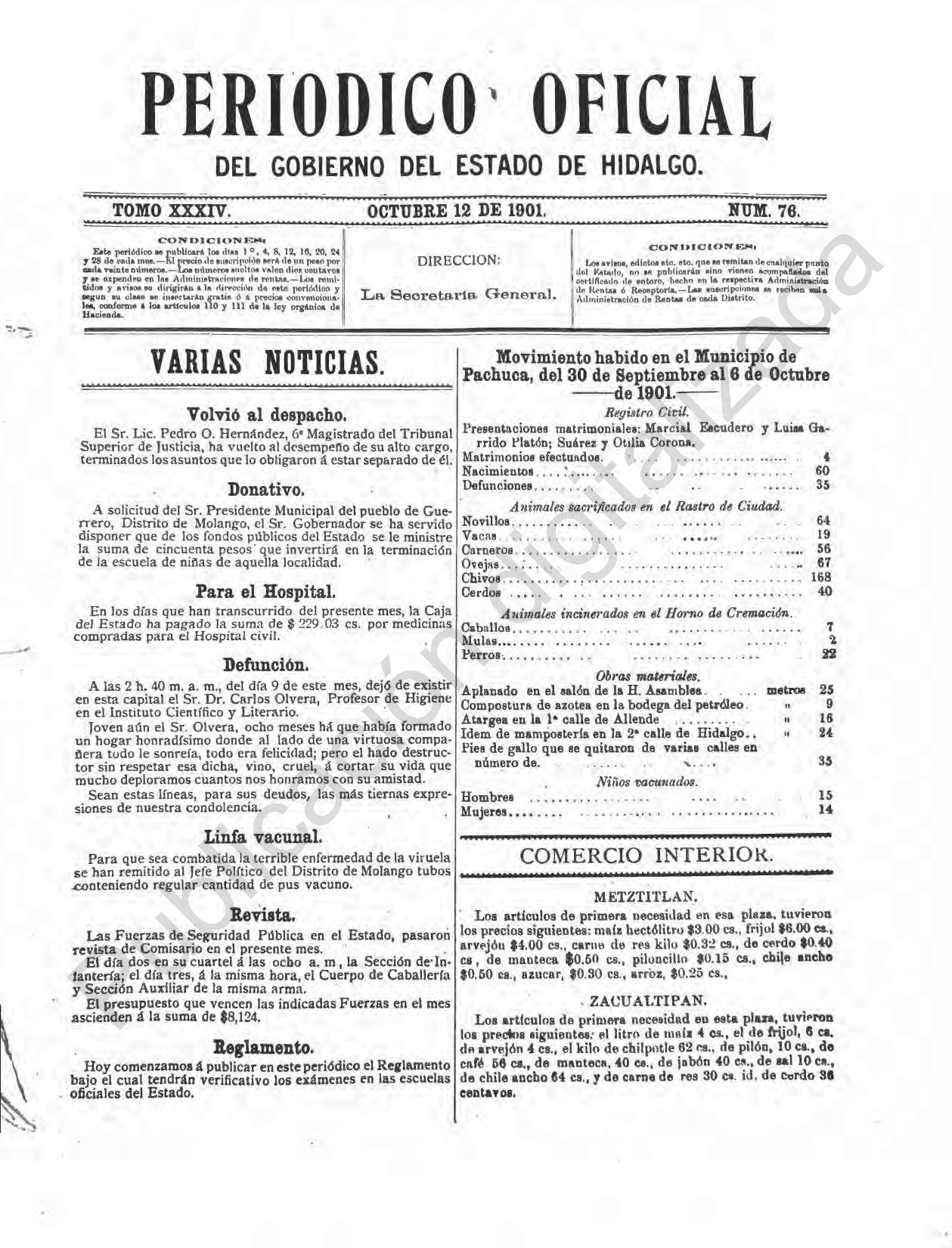 Descargar Periódico Oficial Ordinario 0 del 12 de octubre de 1901Tamaño 1.46 MB