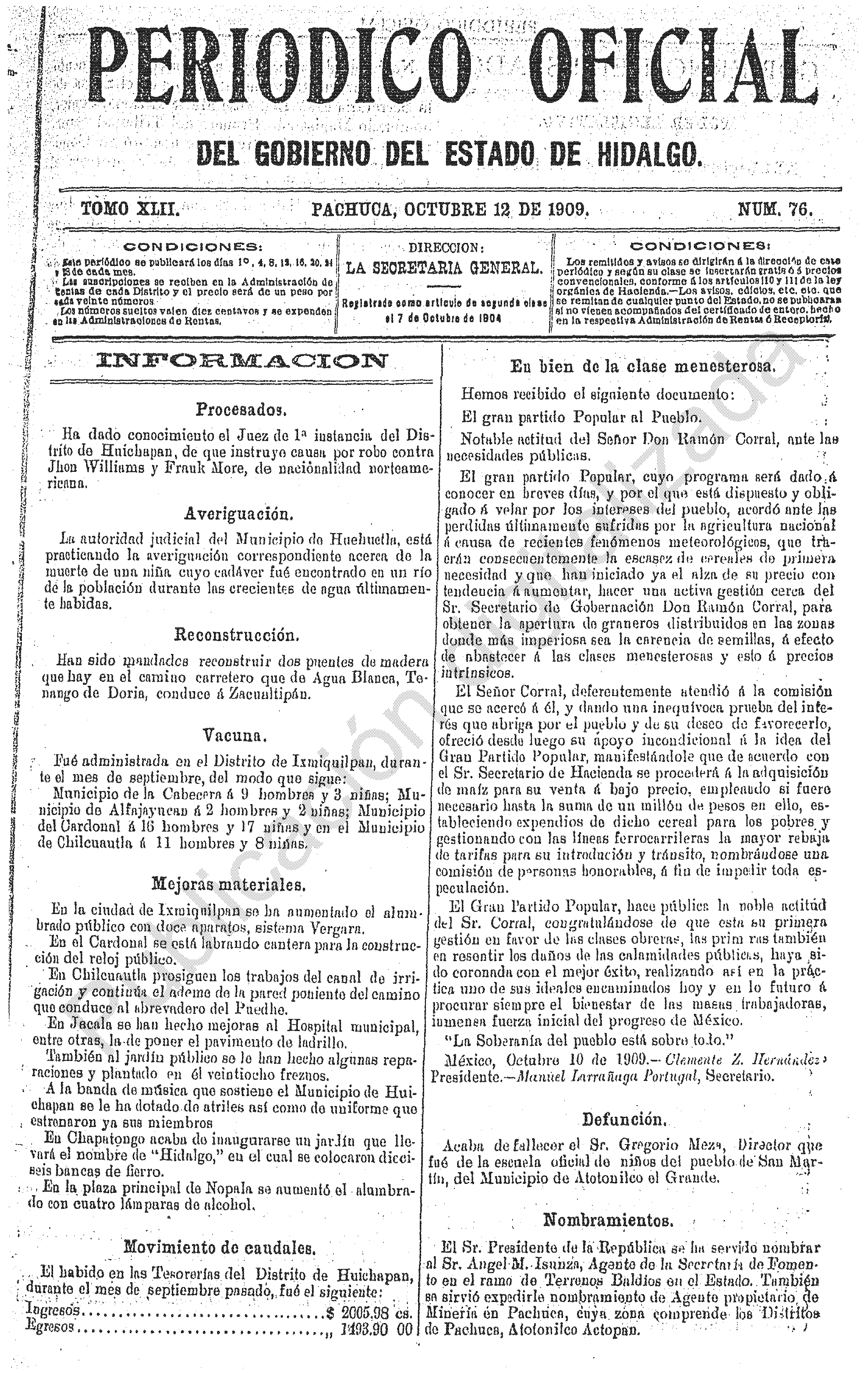 Descargar Periódico Oficial Ordinario 0 del 12 de octubre de 1909Tamaño 850.84 KB