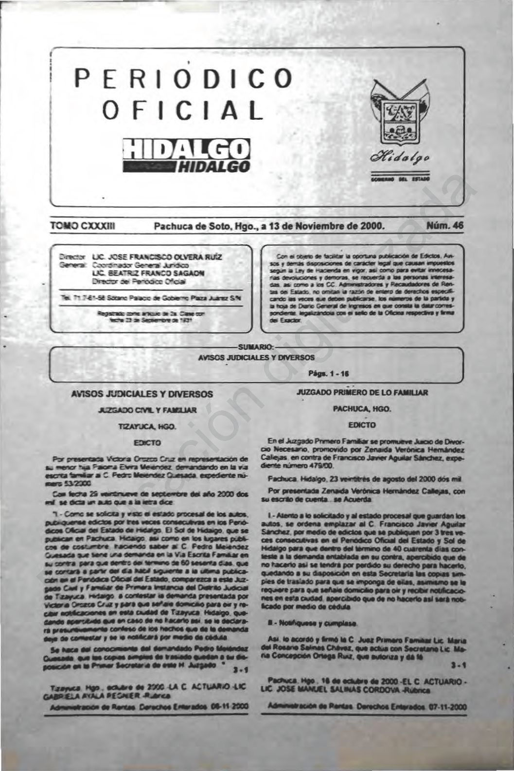 Descargar Periódico Oficial Ordinario 0 del 13 de noviembre de 2000Tamaño 2.41 MB