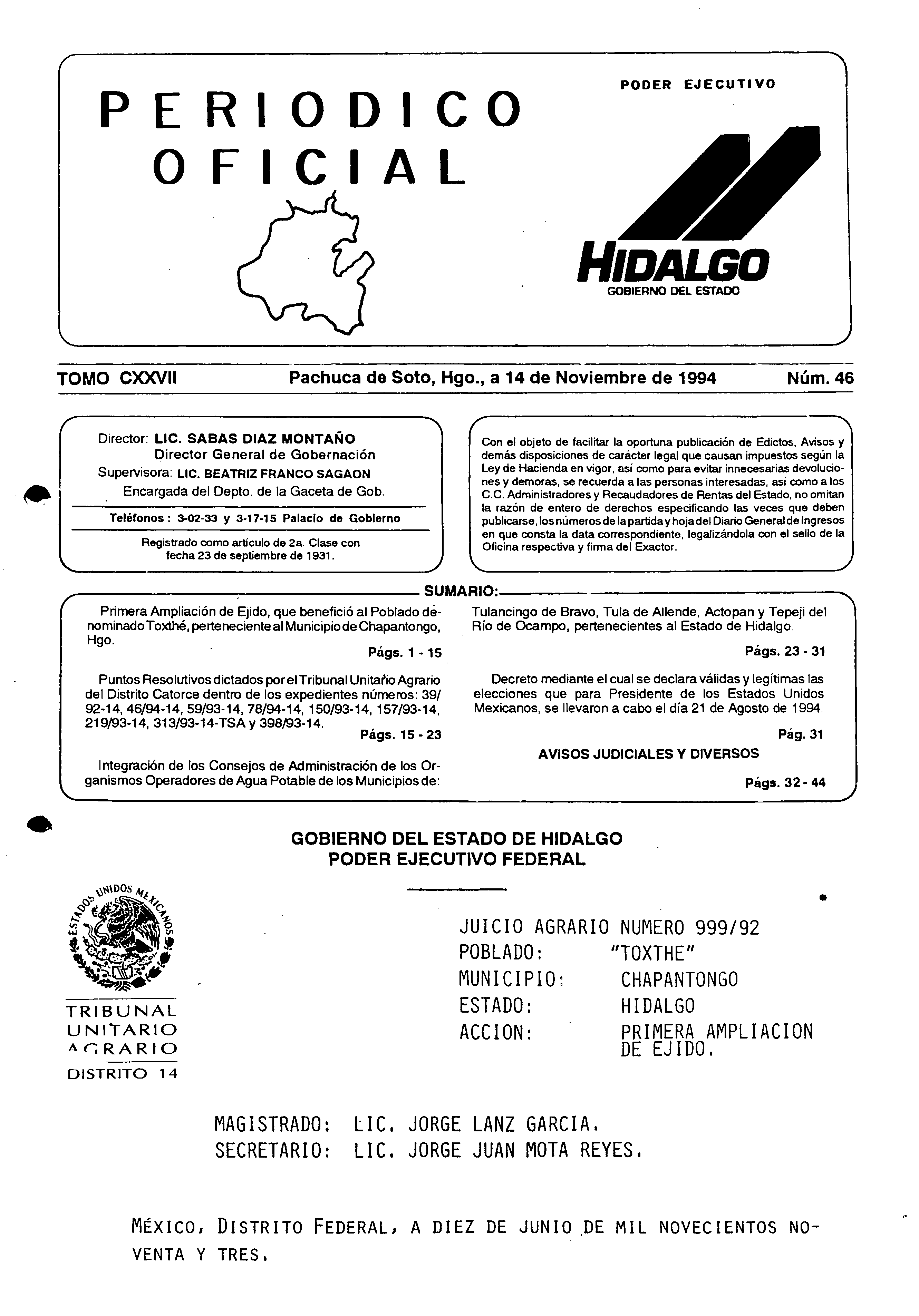 • Primera Ampliación de Ejido, que benefició al Poblado denominado Toxthé, perteneciente al Municipio de Chapantongo, Hgo.