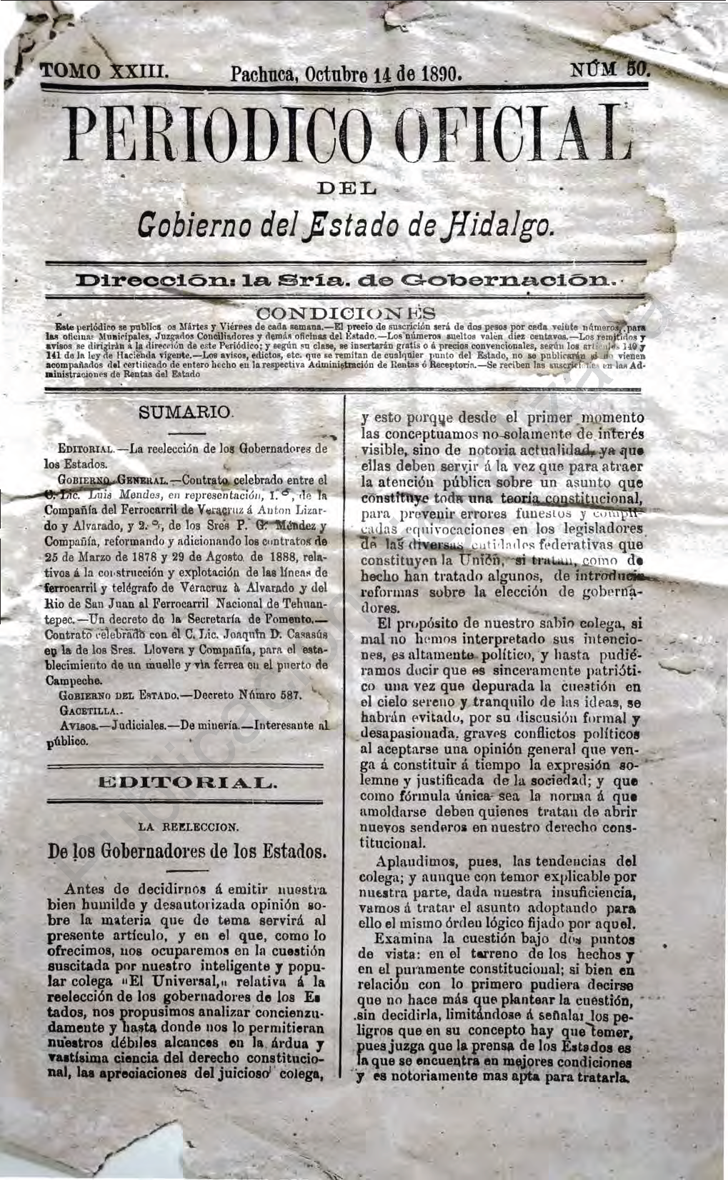 - Rafel Cravioto, Gobernador Constitucional del Estado de Hidalgo, Decreto 587, todos los nacimientos que hubieren tenido verificativo desde el 5 de mayo de 1872 hasta la fecha, podrán ser inscriptos en el Registro Civil hasta el 31 de Marzo del Proximo año de 1891, sin que los interesados incurran en las penas que para los casos de omisipon establece al Ley npumero 531 d 4 de mayo de 1888.