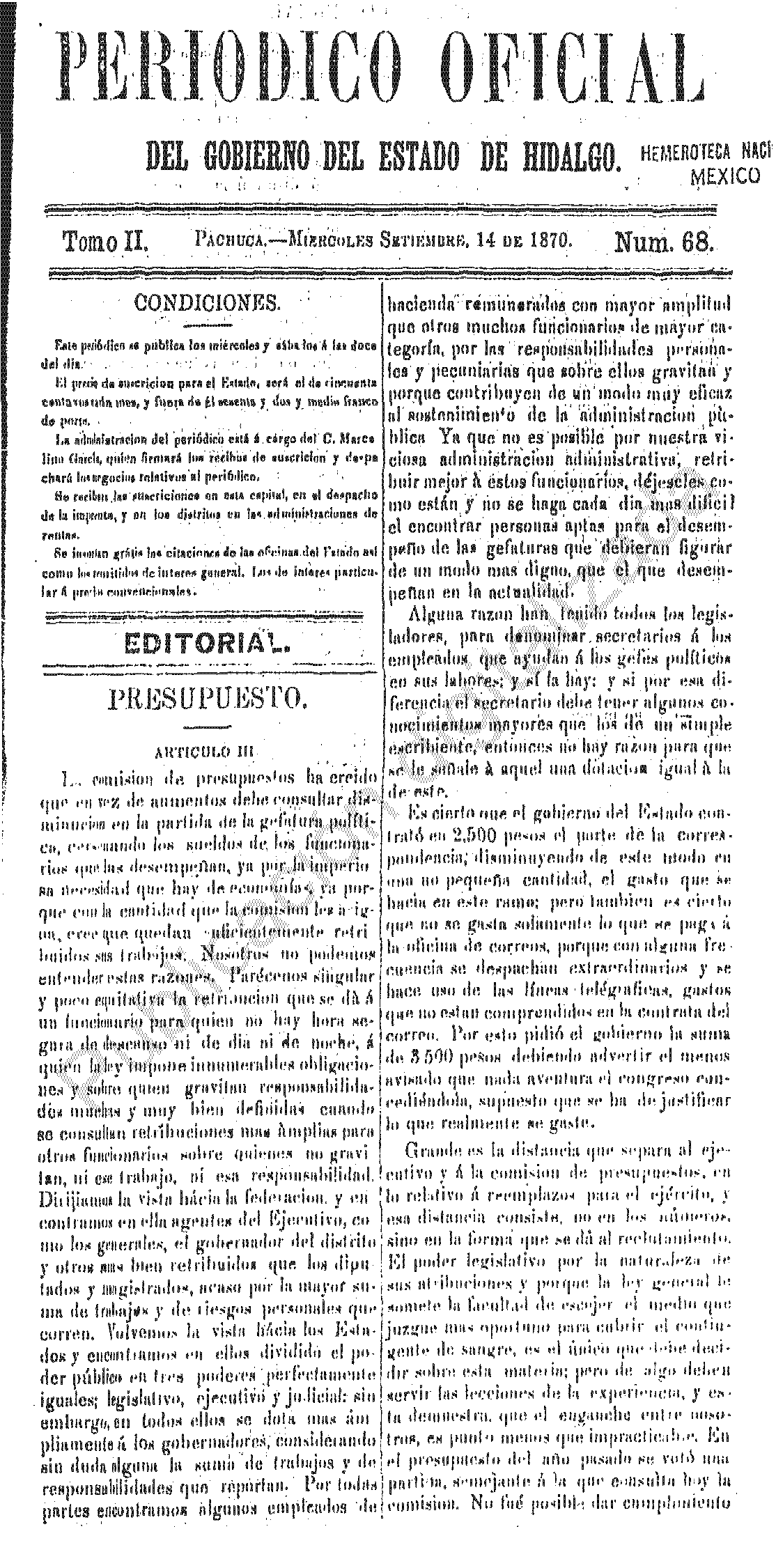 Descargar Periódico Oficial Ordinario 0 del 14 de septiembre de 1870El portal web del Periódico Oficial del Estado de hidalgo es el único medio de difusión oficial del Gobierno del Estado de Hidalgo