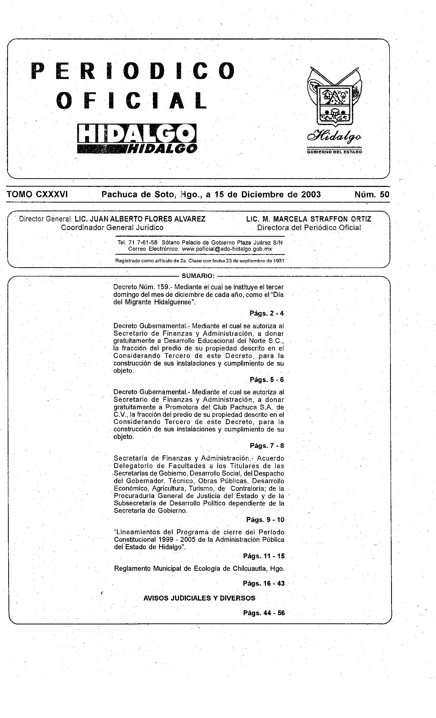 Periódico Oficial Ordinario 0 del 15 de diciembre de 2003