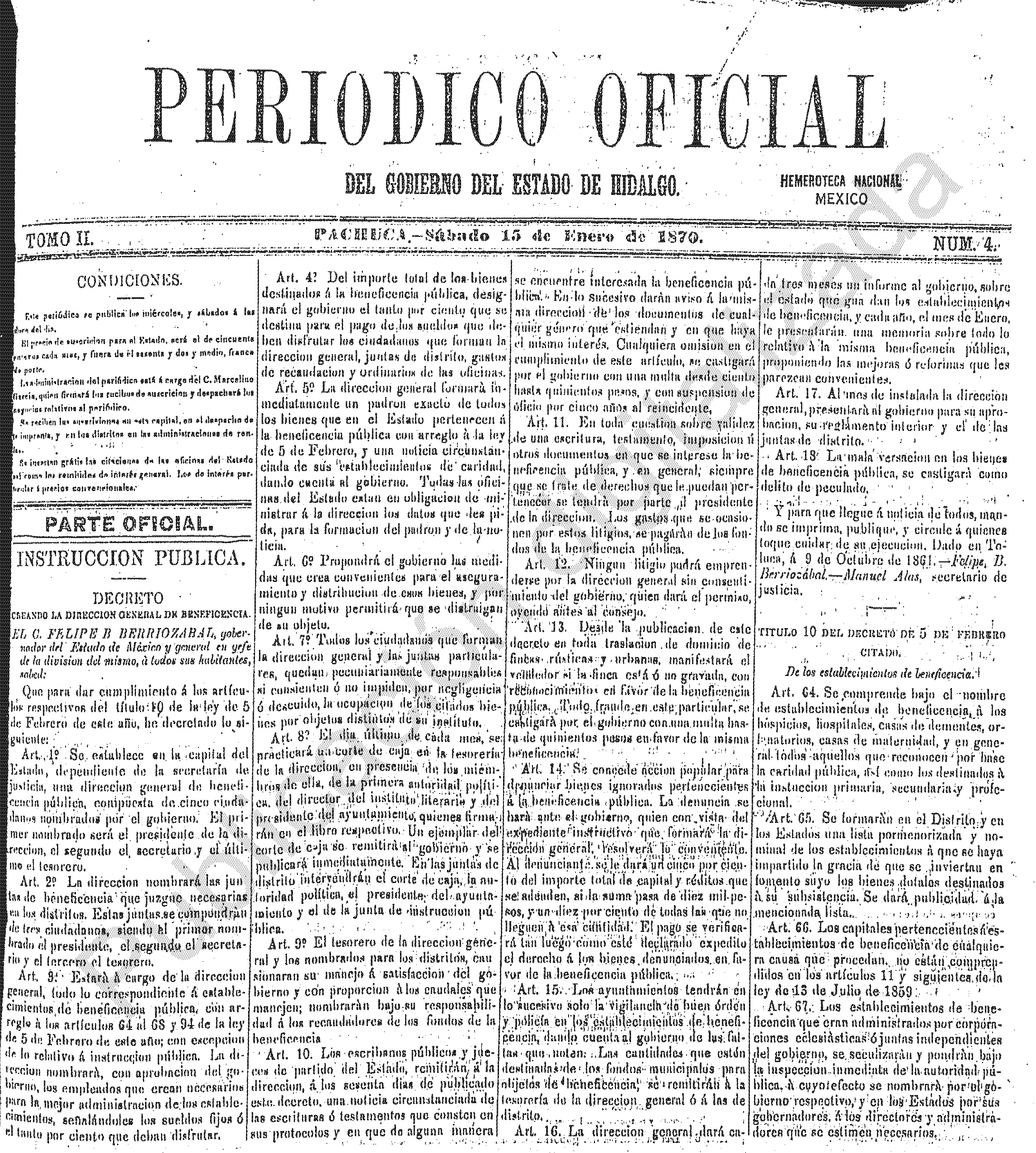 Descargar Periódico Oficial Ordinario 0 del 15 de enero de 1870El portal web del Periódico Oficial del Estado de hidalgo es el único medio de difusión oficial del Gobierno del Estado de Hidalgo