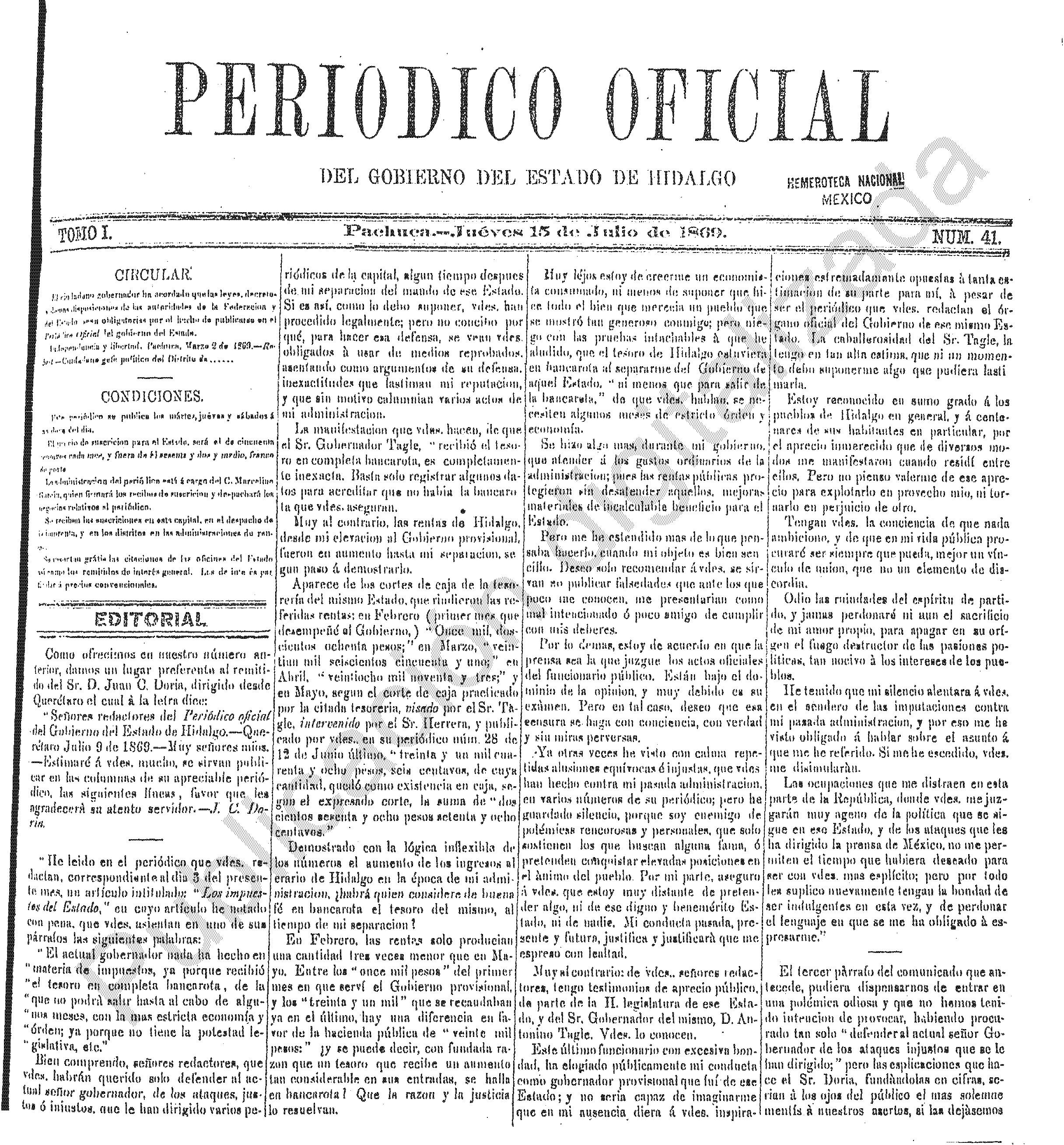 Descargar Periódico Oficial Ordinario 0 del 15 de julio de 1869El portal web del Periódico Oficial del Estado de hidalgo es el único medio de difusión oficial del Gobierno del Estado de Hidalgo