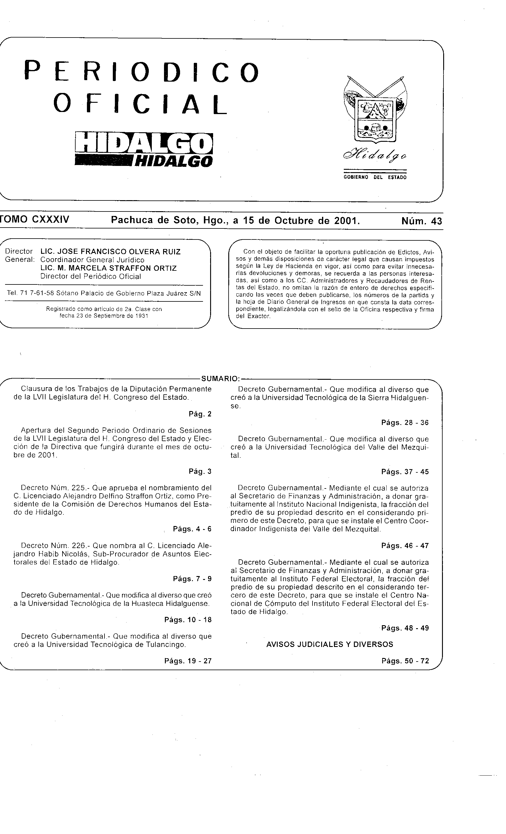 Periódico Oficial Ordinario 0 del 15 de octubre de 2001