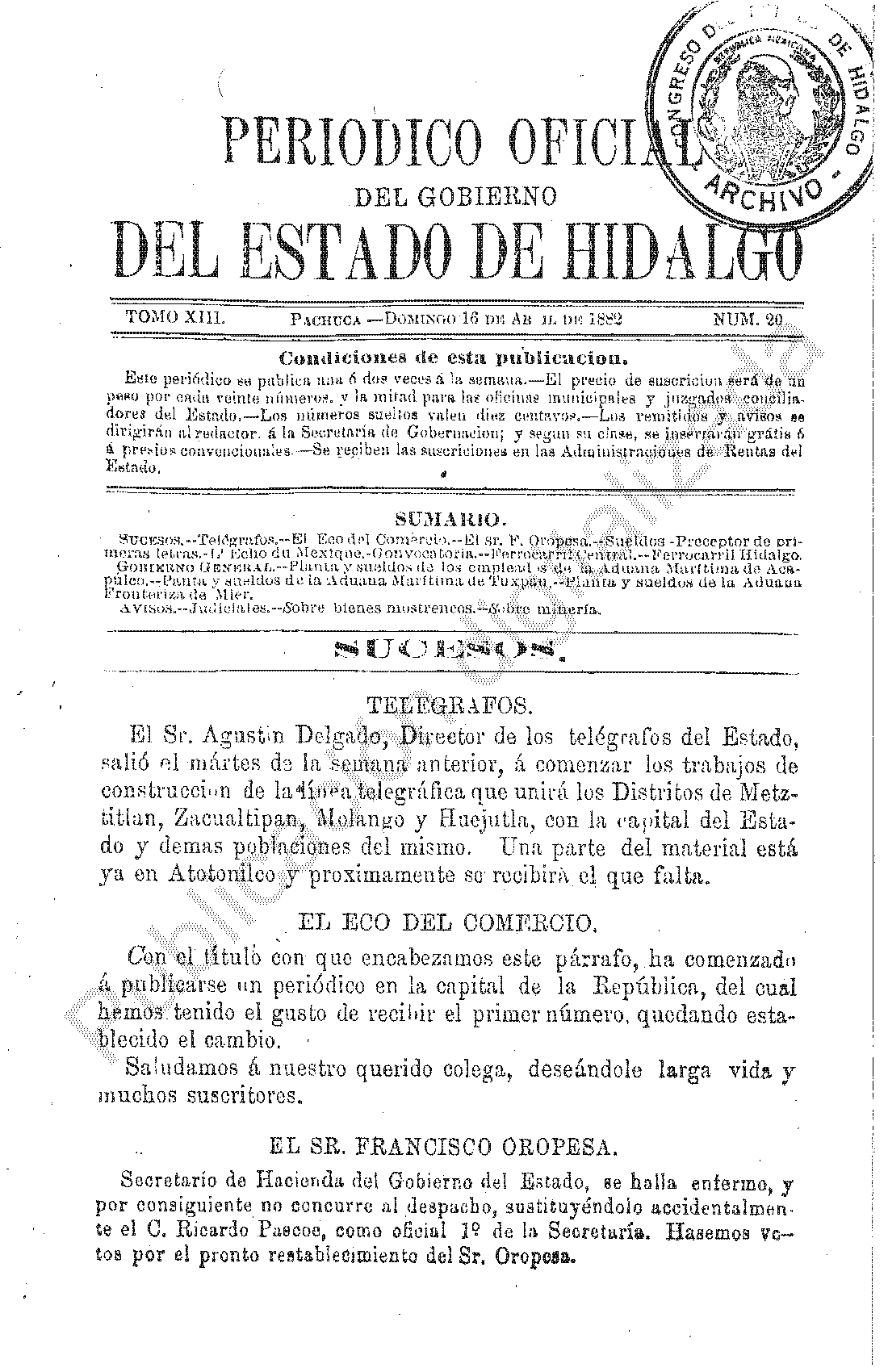 Periódico Oficial Ordinario 0 del 16 de abril de 1882