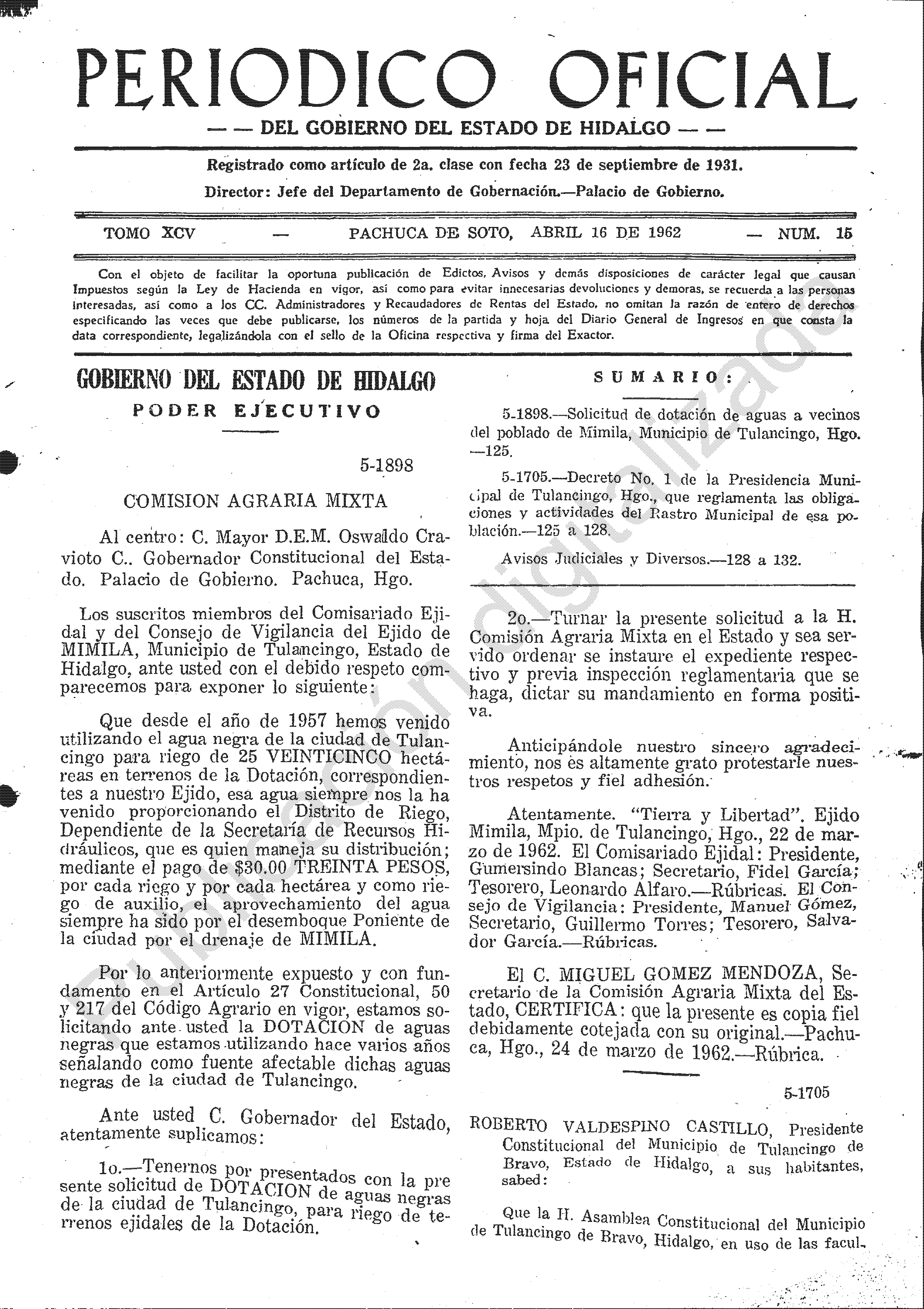 • 5-1898.- Solicitud de dotación de aguas a vecinos del poblado de Mimila, Municipio de Tulancingo, Hgo.