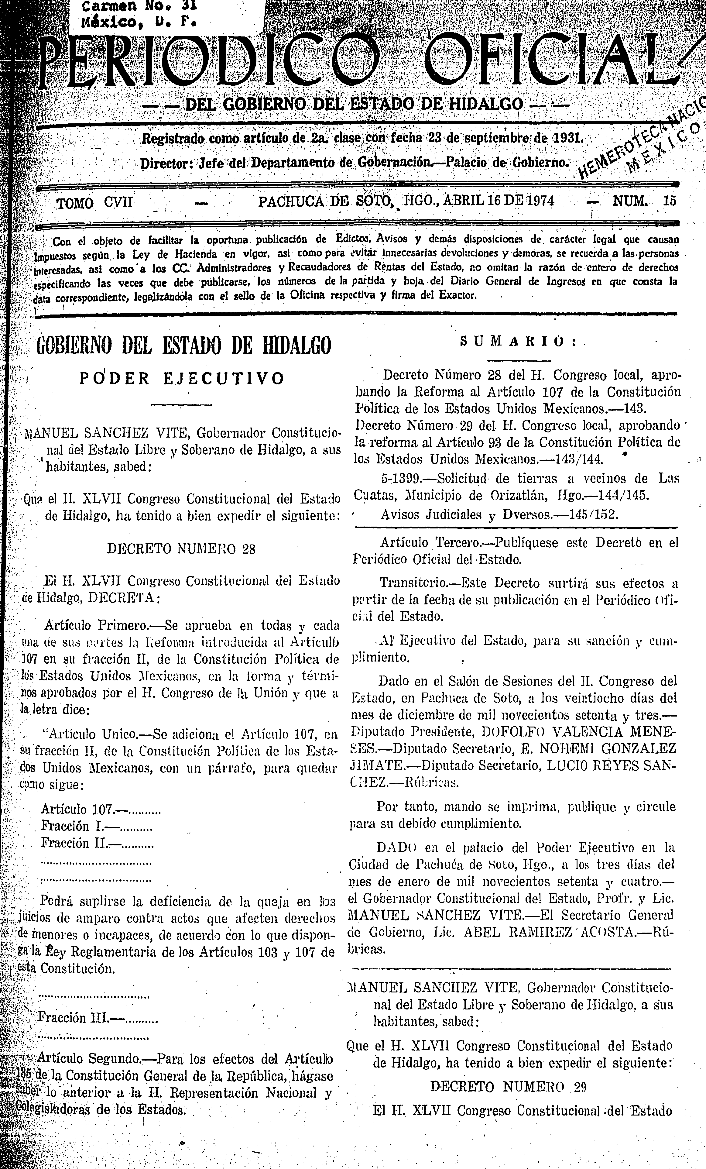 • Decreto Número 28 del H. Congreso local, aprobando la Reforma al Artículo 107 de la Constitución Política de los Estados Unidos Mexicanos.