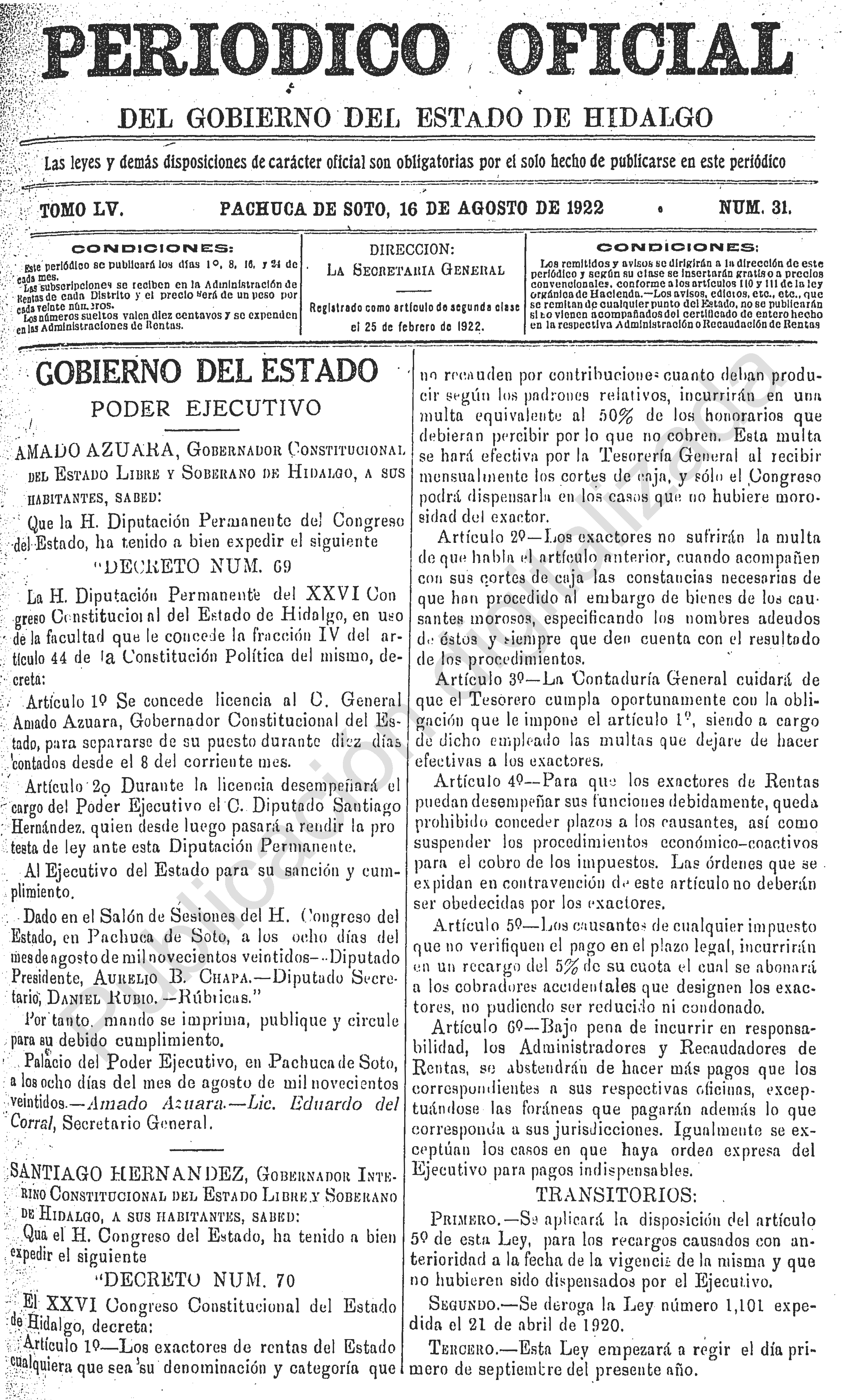 Descargar Periódico Oficial Ordinario 0 del 16 de agosto de 1922El portal web del Periódico Oficial del Estado de hidalgo es el único medio de difusión oficial del Gobierno del Estado de Hidalgo