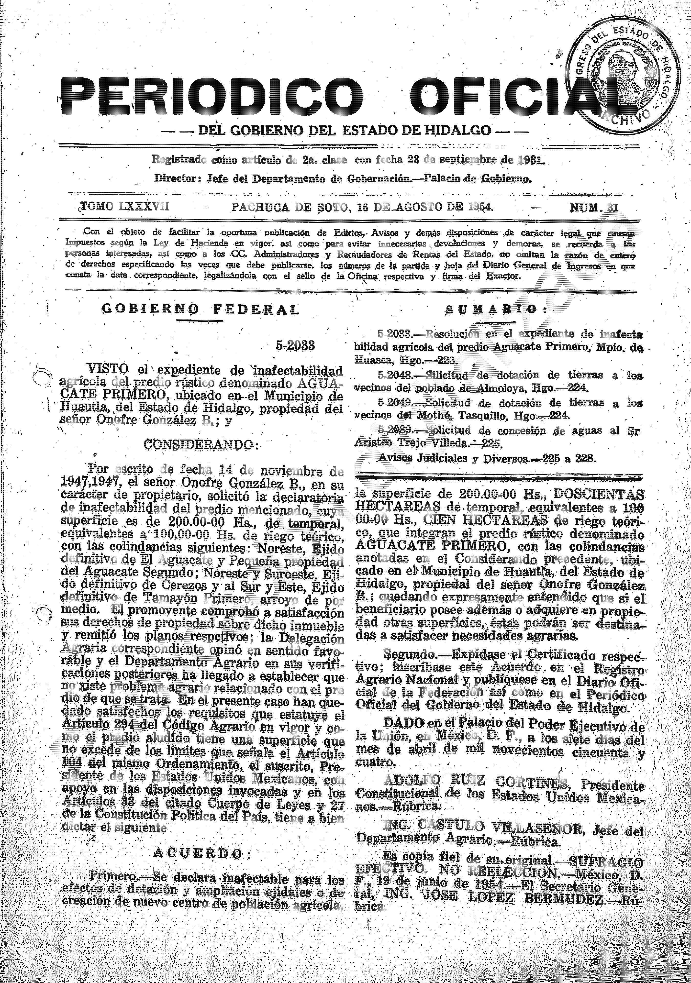 - 5-2033.- Resolución en el expediente de inafectabilidad agrícola del predio Aguacata Primero, Mpio. de Huasca, Hgo.